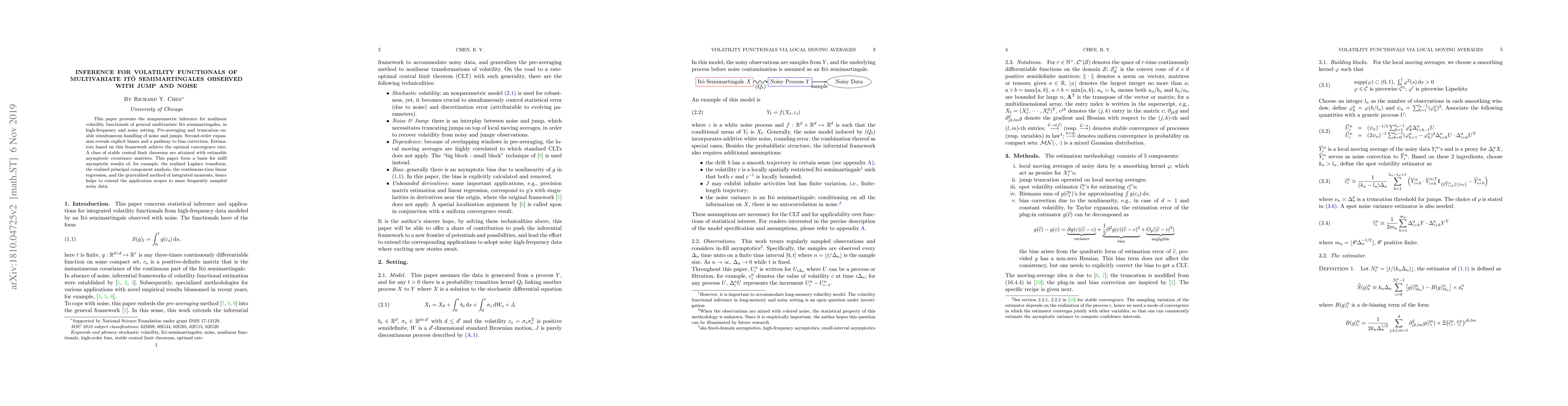 This paper develops nonparametric inference methods for estimating volatility functionals of multivariate Itô semimartingales under high-frequency noisy observations, achieving optimal convergence rates and providing a framework for various advanced statistical techniques. The approach handles noise and jumps through pre-averaging and truncation, and establishes stable central limit theorems with estimable asymptotic covariance matrices.