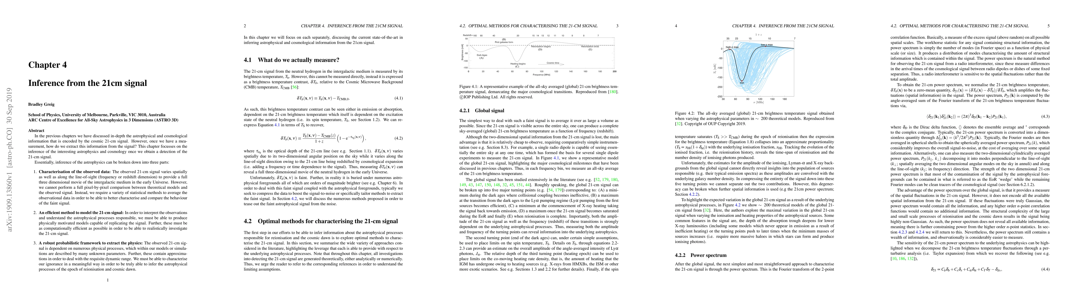 Once we have a measurement, how do we extract this information from the signal? This chapter focusses on the inference of the interesting astrophysics and cosmology once we obtain a detection of the 21-cm signal. Essentially, inference of the astrophysics can be broken down into three parts: 1. Characterisation of the observed data: The observed 21-cm signal varies spatially as well as along the line-of-sight (frequency or redshift dimension) to provide a full three dimensional movie of the intergalactic medium in the early Universe. However, we cannot perform a full pixel-by-pixel comparison between theoretical models and the observed signal. Instead, we require a variety of statistical methods to average the observational data in order to be able to better characterise and compare the behaviour of the faint signal. 2. An efficient method to model the 21-cm signal: In order to interpret the observations and understand the astrophysical processes responsible, we must be able to produce physically motivated models capable of replicating the signal. Further, these must be as computationally efficient as possible in order to be able to realistically investigate the 21-cm signal. 3. A robust probabilistic framework to extract the physics: The observed 21-cm signal is dependent on numerous physical processes, which within our models or simulations are described by many unknown parameters. Further, these contain approximations in order to deal with the requisite dynamic range. We must be able to characterise our ignorance in a meaningful way in order to be truly able to infer the astrophysical processes of the epoch of reionisation and cosmic dawn. In this chapter we will focus on each separately, discussing the current state-of-the-art in inferring astrophysical and cosmological information from the 21cm signal.