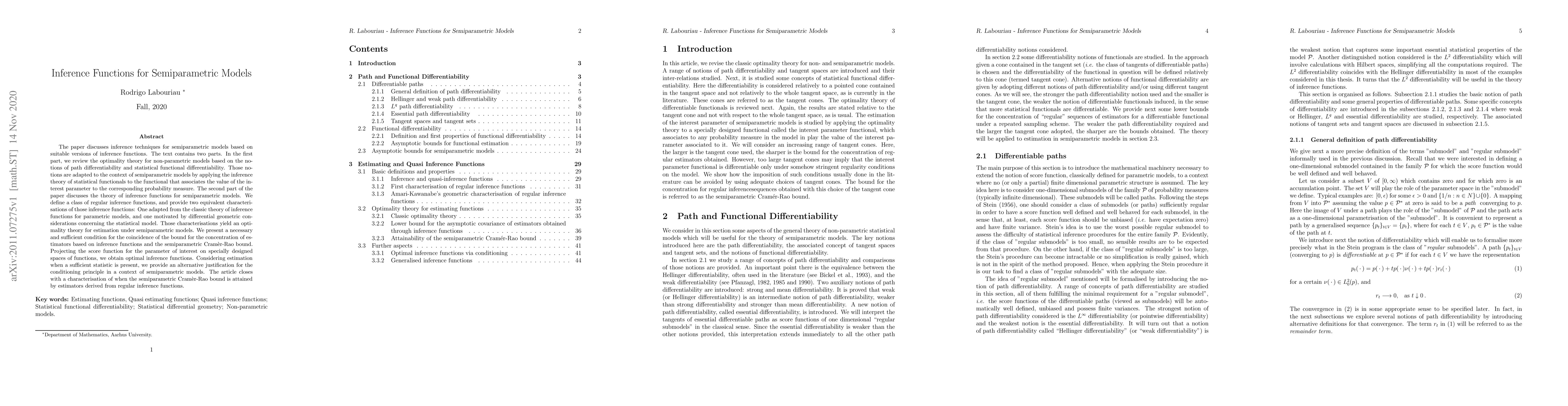 The paper discusses inference techniques for semiparametric models based on suitable versions of inference functions. The text contains two parts. In the first part, we review the optimality theory for non-parametric models based on the notions of path differentiability and statistical functional differentiability. Those notions are adapted to the context of semiparametric models by applying the inference theory of statistical functionals to the functional that associates the value of the interest parameter to the corresponding probability measure. The second part of the paper discusses the theory of inference functions for semiparametric models. We define a class of regular inference functions, and provide two equivalent characterisations of those inference functions: One adapted from the classic theory of inference functions for parametric models, and one motivated by differential geometric considerations concerning the statistical model. Those characterisations yield an optimality theory for estimation under semiparametric models. We present a necessary and sufficient condition for the coincidence of the bound for the concentration of estimators based on inference functions and the semiparametric Cram\`er-Rao bound. Projecting the score function for the parameter of interest on specially designed spaces of functions, we obtain optimal inference functions. Considering estimation when a sufficient statistic is present, we provide an alternative justification for the conditioning principle in a context of semiparametric models. The article closes with a characterisation of when the semiparametric Cram\`er-Rao bound is attained by estimators derived from regular inference functions.