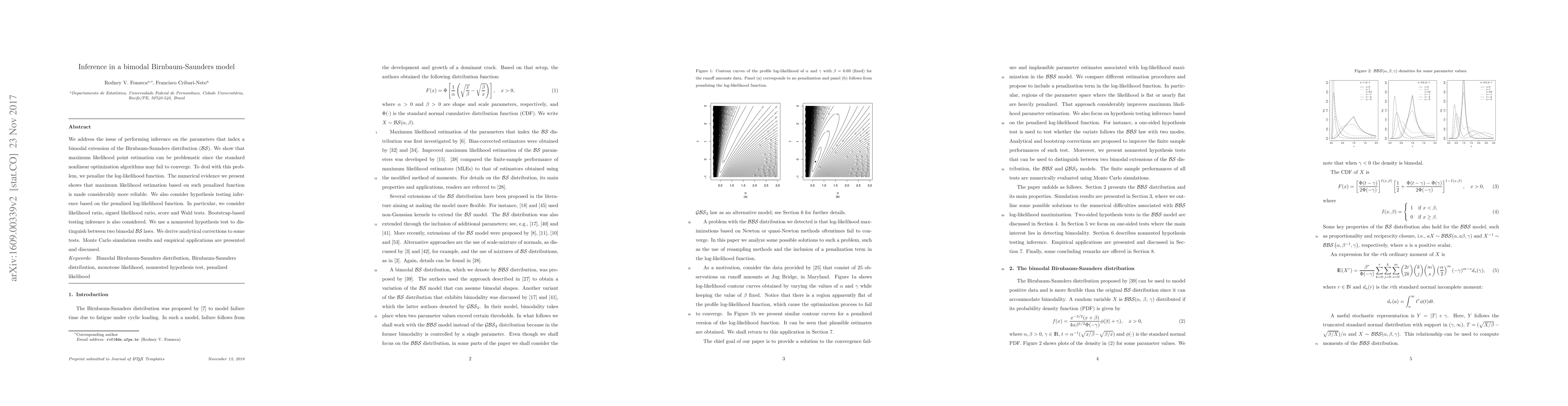This paper explores inference methods for a bimodal extension of the Birnbaum-Saunders distribution, addressing challenges with maximum likelihood estimation due to potential non-convergence. It proposes penalized maximum likelihood and various hypothesis tests, including likelihood ratio, score, and Wald tests, to improve reliability and distinguish between bimodal BS laws.