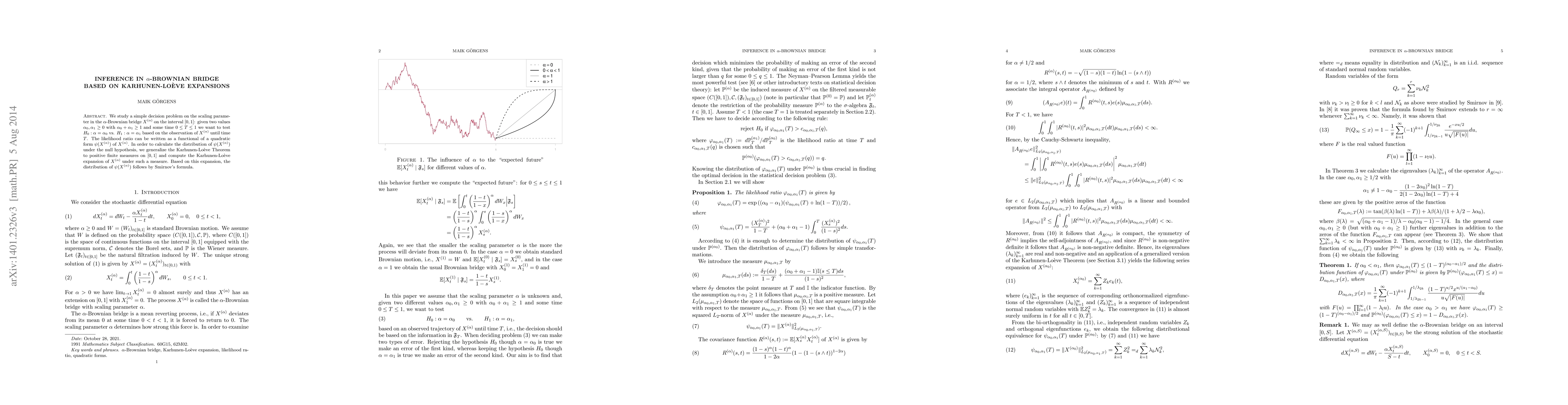We study a simple decision problem on the scaling parameter in the $\alpha$-Brownian bridge $X^{(\alpha)}$ on the interval $[0,1]$: given two values $\alpha_0, \alpha_1 \geq 0$ with $\alpha_0 + \alpha_1 \geq 1$ and some time $0 \leq T \leq 1$ we want to test $H_0: \alpha = \alpha_0$ vs. $H_1: \alpha = \alpha_1$ based on the observation of $X^{(\alpha)}$ until time $T$. The likelihood ratio can be written as a functional of a quadratic form $\psi(X^{(\alpha)})$ of $X^{(\alpha)}$. In order to calculate the distribution of $\psi(X^{(\alpha)})$ under the null hypothesis, we generalize the Karhunen-Lo\`eve Theorem to positive finite measures on $[0,1]$ and compute the Karhunen-Lo\`eve expansion of $X^{(\alpha)}$ under such a measure. Based on this expansion, the distribution of $\psi(X^{(\alpha)})$ follows by Smirnov's formula.