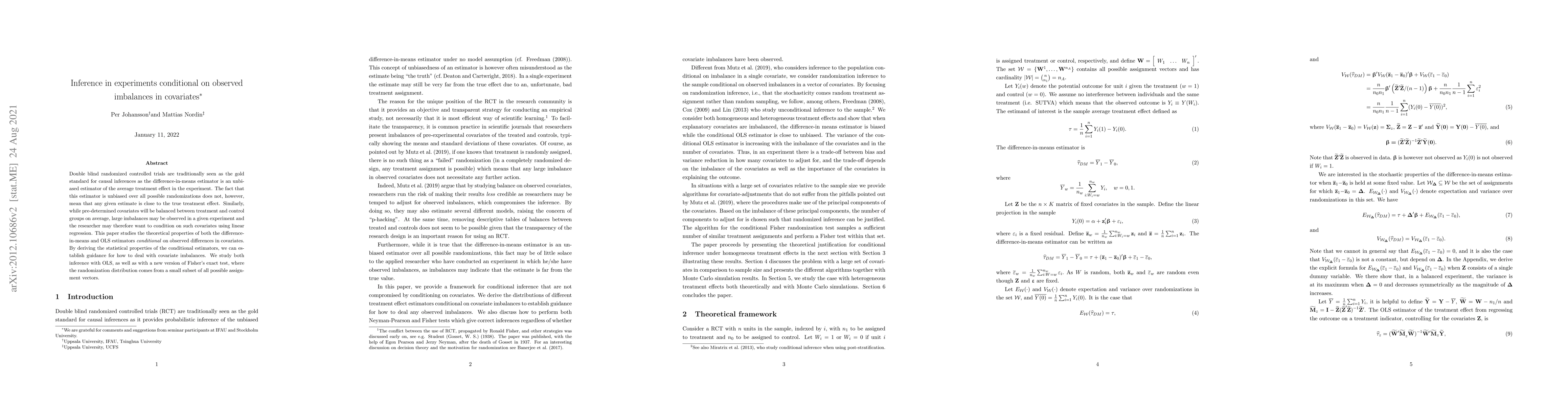 Double blind randomized controlled trials are traditionally seen as the gold standard for causal inferences as the difference-in-means estimator is an unbiased estimator of the average treatment effect in the experiment. The fact that this estimator is unbiased over all possible randomizations does not, however, mean that any given estimate is close to the true treatment effect. Similarly, while pre-determined covariates will be balanced between treatment and control groups on average, large imbalances may be observed in a given experiment and the researcher may therefore want to condition on such covariates using linear regression. This paper studies the theoretical properties of both the difference-in-means and OLS estimators \emph{conditional} on observed differences in covariates. By deriving the statistical properties of the conditional estimators, we can establish guidance for how to deal with covariate imbalances. We study both inference with OLS, as well as with a new version of Fisher's exact test, where the randomization distribution comes from a small subset of all possible assignment vectors.