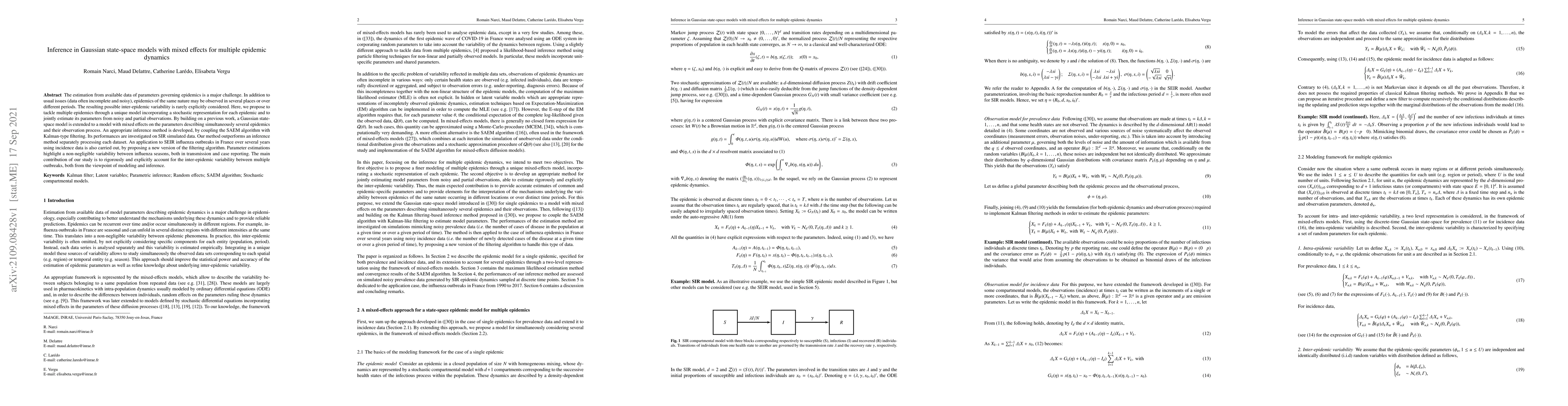 This paper proposes a Gaussian state-space model with mixed effects to estimate parameters for multiple epidemics, addressing inter-epidemic variability. The developed inference method, combining the SAEM algorithm with Kalman filtering, outperforms separate processing and highlights significant variability in transmission and reporting across different influenza seasons in France.