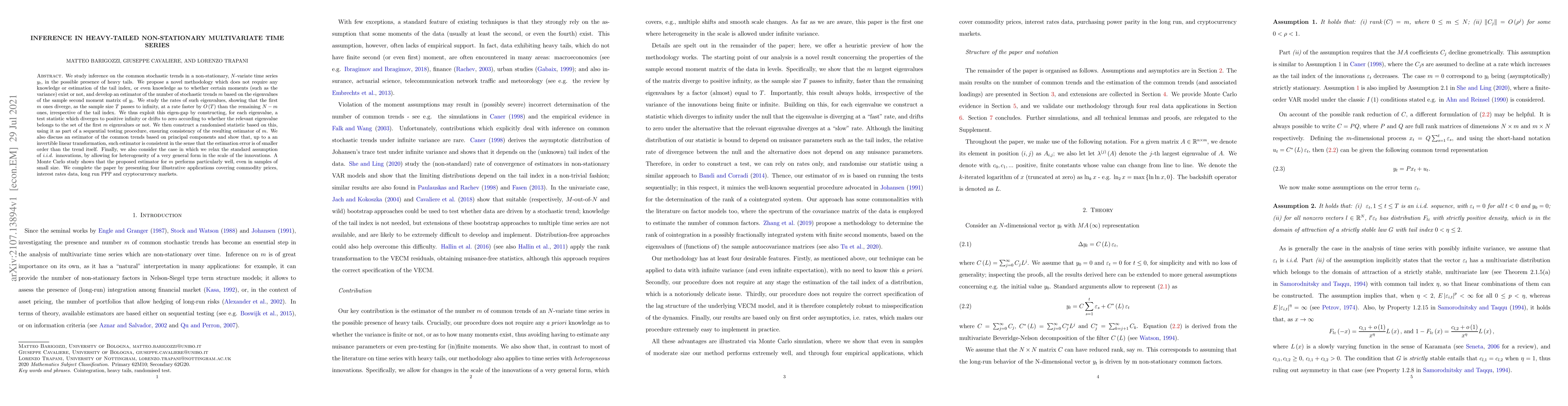 We study inference on the common stochastic trends in a non-stationary, $N$-variate time series $y_{t}$, in the possible presence of heavy tails. We propose a novel methodology which does not require any knowledge or estimation of the tail index, or even knowledge as to whether certain moments (such as the variance) exist or not, and develop an estimator of the number of stochastic trends $m$ based on the eigenvalues of the sample second moment matrix of $y_{t}$. We study the rates of such eigenvalues, showing that the first $m$ ones diverge, as the sample size $T$ passes to infinity, at a rate faster by $O\left(T \right)$ than the remaining $N-m$ ones, irrespective of the tail index. We thus exploit this eigen-gap by constructing, for each eigenvalue, a test statistic which diverges to positive infinity or drifts to zero according to whether the relevant eigenvalue belongs to the set of the first $m$ eigenvalues or not. We then construct a randomised statistic based on this, using it as part of a sequential testing procedure, ensuring consistency of the resulting estimator of $m$. We also discuss an estimator of the common trends based on principal components and show that, up to a an invertible linear transformation, such estimator is consistent in the sense that the estimation error is of smaller order than the trend itself. Finally, we also consider the case in which we relax the standard assumption of \textit{i.i.d.} innovations, by allowing for heterogeneity of a very general form in the scale of the innovations. A Monte Carlo study shows that the proposed estimator for $m$ performs particularly well, even in samples of small size. We complete the paper by presenting four illustrative applications covering commodity prices, interest rates data, long run PPP and cryptocurrency markets.