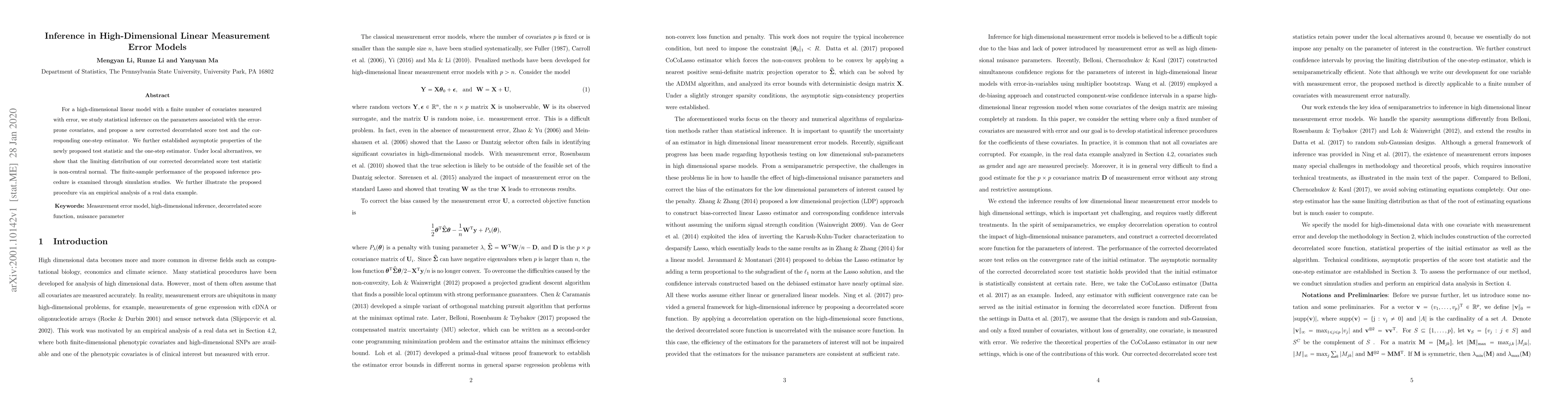 This paper proposes a new corrected decorrelated score test and a one-step estimator for high-dimensional linear models with measurement error, establishing their asymptotic properties and demonstrating non-central normal limiting distribution under local alternatives. The method's effectiveness is validated through simulation studies and a real data example.
