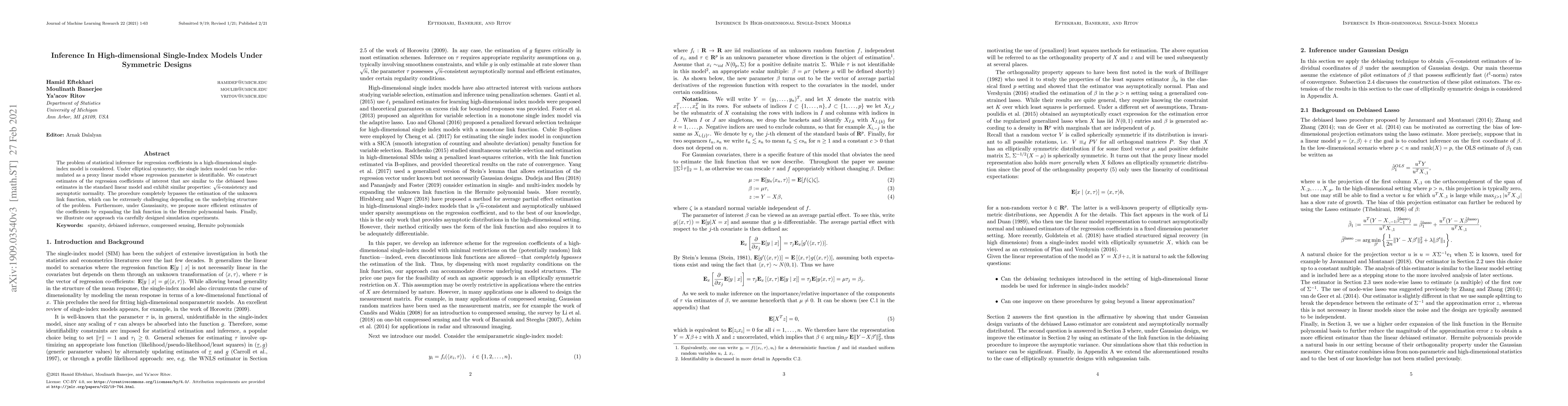 The problem of statistical inference for regression coefficients in a high-dimensional single-index model is considered. Under elliptical symmetry, the single index model can be reformulated as a proxy linear model whose regression parameter is identifiable. We construct estimates of the regression coefficients of interest that are similar to the debiased lasso estimates in the standard linear model and exhibit similar properties: root-n-consistency and asymptotic normality. The procedure completely bypasses the estimation of the unknown link function, which can be extremely challenging depending on the underlying structure of the problem. Furthermore, under Gaussianity, we propose more efficient estimates of the coefficients by expanding the link function in the Hermite polynomial basis. Finally, we illustrate our approach via carefully designed simulation experiments.