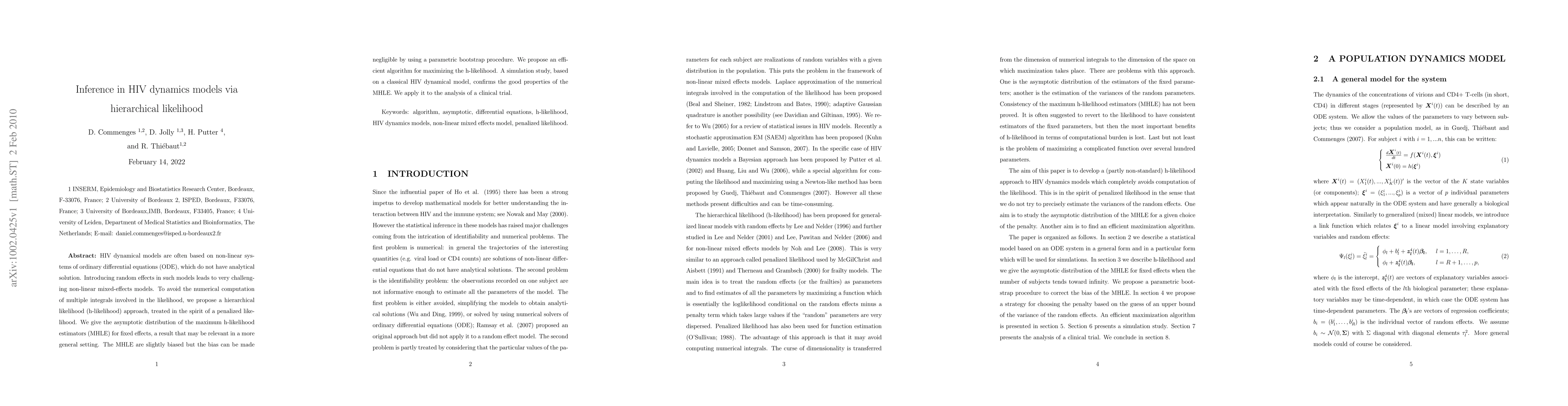 This paper proposes a hierarchical likelihood approach to infer parameters in HIV dynamical models, which are typically non-linear mixed-effects models without analytical solutions. The method avoids complex numerical computations and provides an efficient algorithm for estimation, confirmed through simulations and application to a clinical trial dataset.