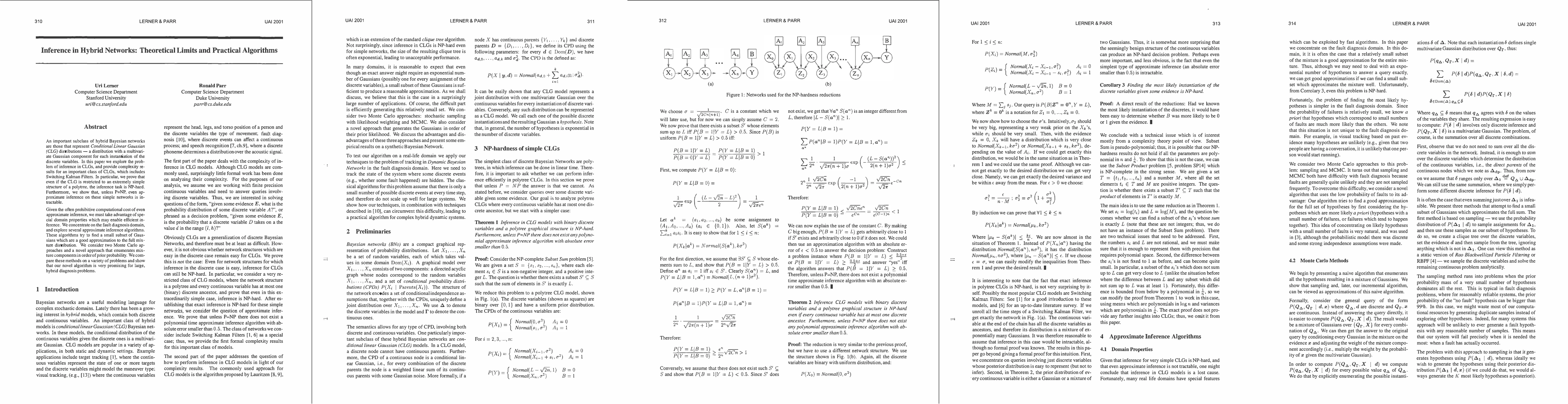 This paper investigates the computational complexity of inference in Conditional Linear Gaussian (CLG) hybrid Bayesian networks, proving that even simple CLG structures are NP-hard to infer. To address this, it proposes several approximate inference algorithms, including Monte Carlo methods and a novel component enumeration technique, demonstrating the latter's effectiveness for large-scale hybrid diagnosis tasks.