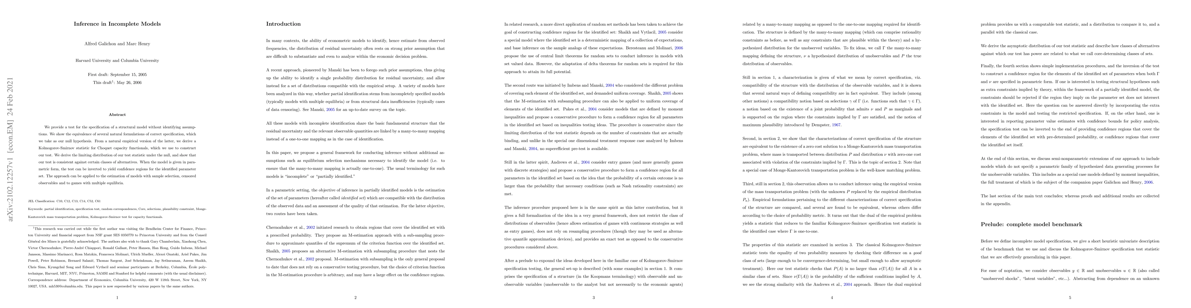 This paper introduces a new test for specifying structural models without making strong assumptions, allowing for estimation of incomplete models with sample selection and censored observables. The approach provides consistent testing and confidence regions for identified parameter sets.