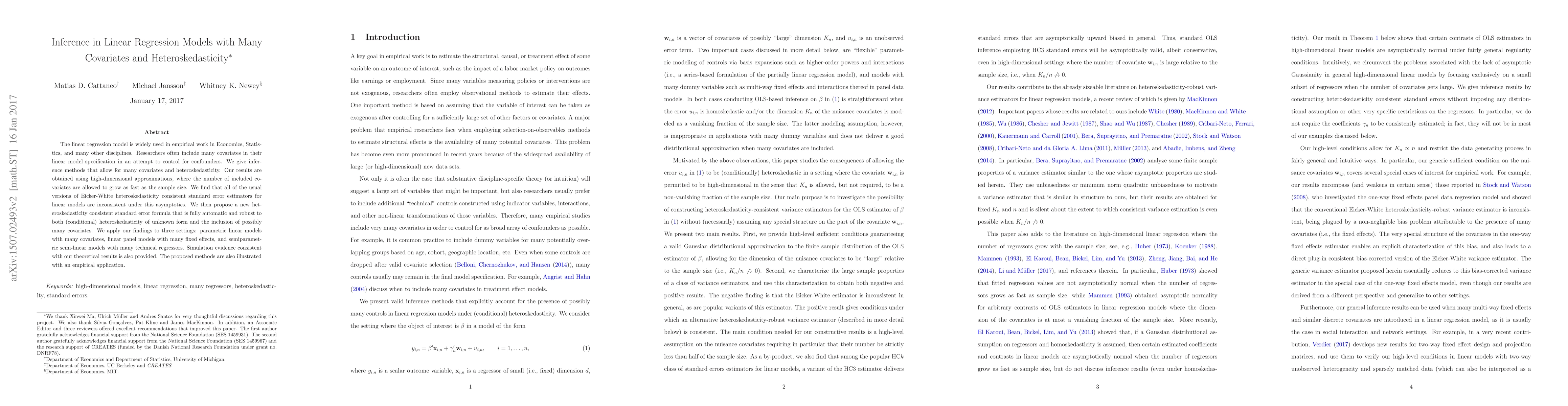 This paper develops inference methods for linear regression models with many covariates and heteroskedasticity, showing that traditional Eicker-White standard error estimators are inconsistent. It proposes a new robust, fully automatic standard error formula that works under high-dimensional approximations and is applied to various model settings with empirical validation.
