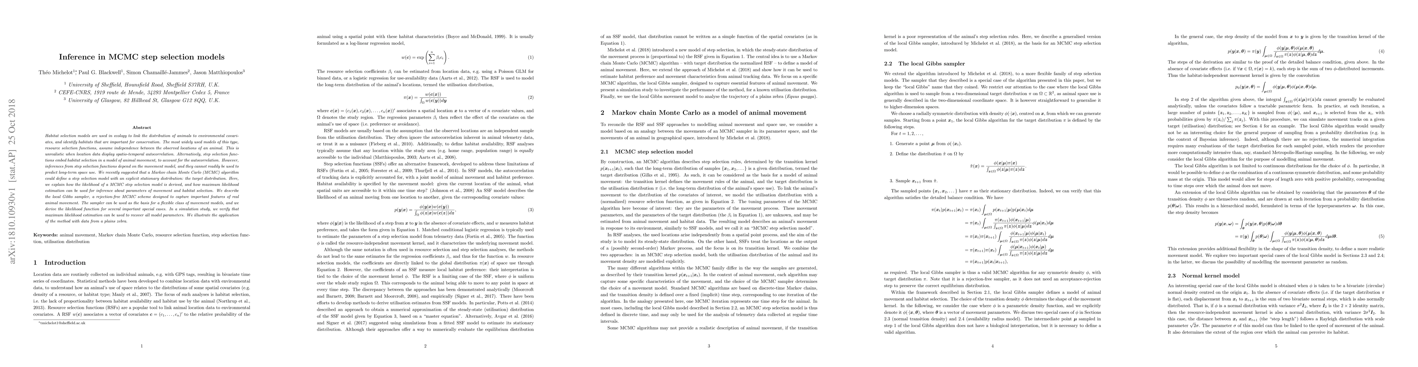 This paper develops an MCMC algorithm for step selection models to account for spatio-temporal autocorrelation in animal movement data, providing a framework for parameter inference and demonstrating its application with plains zebra data. The local Gibbs sampler is introduced as a rejection-free MCMC scheme to model animal movement effectively.