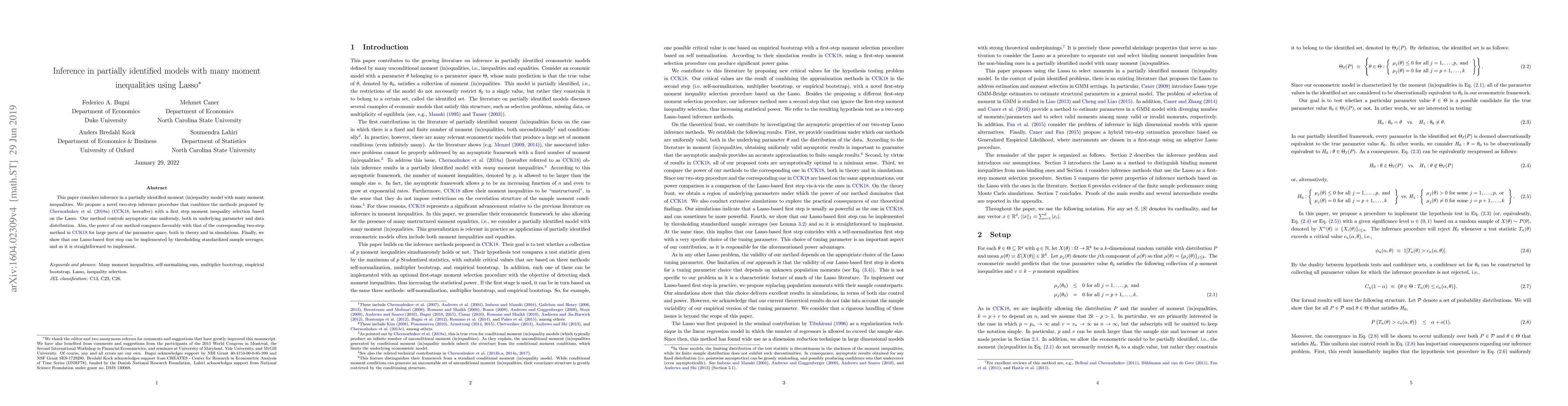 This paper proposes a novel two-step inference method for partially identified models with many moment inequalities, combining Lasso-based moment inequality selection with the CCK18 approach. The method maintains uniform asymptotic size control and demonstrates improved power compared to CCK18, with straightforward implementation via thresholding standardized sample averages.