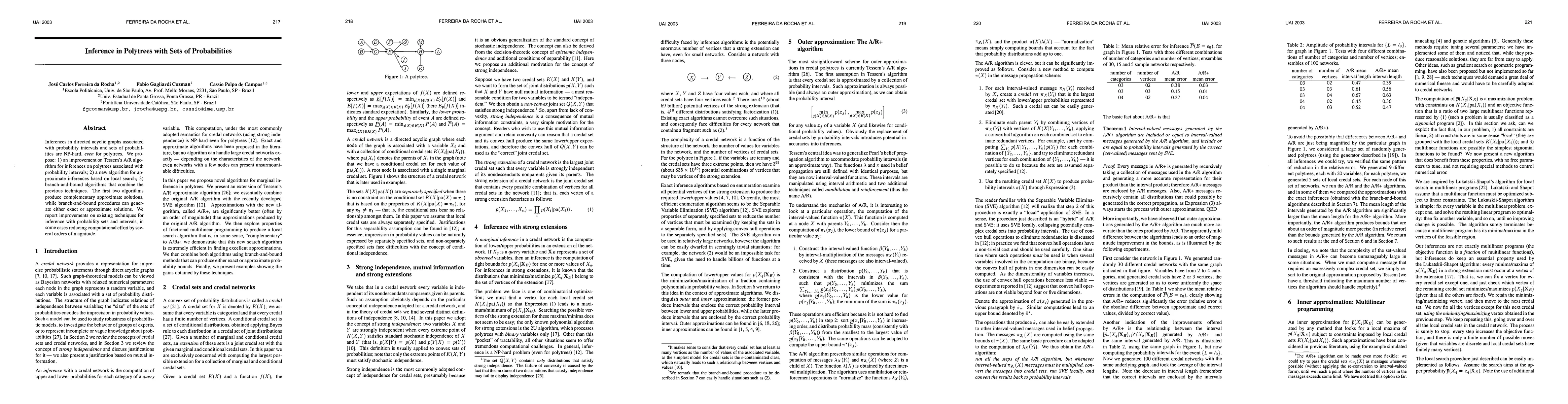 Inferences in directed acyclic graphs associated with probability sets and probability intervals are NP-hard, even for polytrees. In this paper we focus on such inferences, and propose: 1) a substantial improvement on Tessems A / R algorithm FOR polytrees WITH probability intervals; 2) a new algorithm FOR direction - based local search(IN sets OF probability) that improves ON existing methods; 3) a collection OF branch - AND - bound algorithms that combine the previous techniques.The first two techniques lead TO approximate solutions, WHILE branch - AND - bound procedures can produce either exact OR approximate solutions.We report ON dramatic improvements ON existing techniques FOR inference WITH probability sets AND intervals, IN SOME cases reducing the computational effort BY many orders OF magnitude.