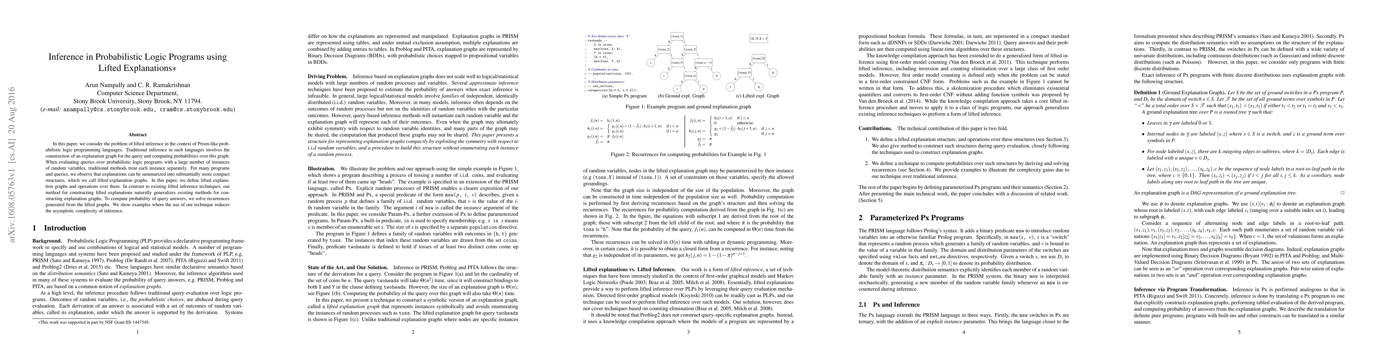 In this paper, we consider the problem of lifted inference in the context of Prism-like probabilistic logic programming languages. Traditional inference in such languages involves the construction of an explanation graph for the query and computing probabilities over this graph. When evaluating queries over probabilistic logic programs with a large number of instances of random variables, traditional methods treat each instance separately. For many programs and queries, we observe that explanations can be summarized into substantially more compact structures, which we call lifted explanation graphs. In this paper, we define lifted explanation graphs and operations over them. In contrast to existing lifted inference techniques, our method for constructing lifted explanations naturally generalizes existing methods for constructing explanation graphs. To compute probability of query answers, we solve recurrences generated from the lifted graphs. We show examples where the use of our technique reduces the asymptotic complexity of inference.