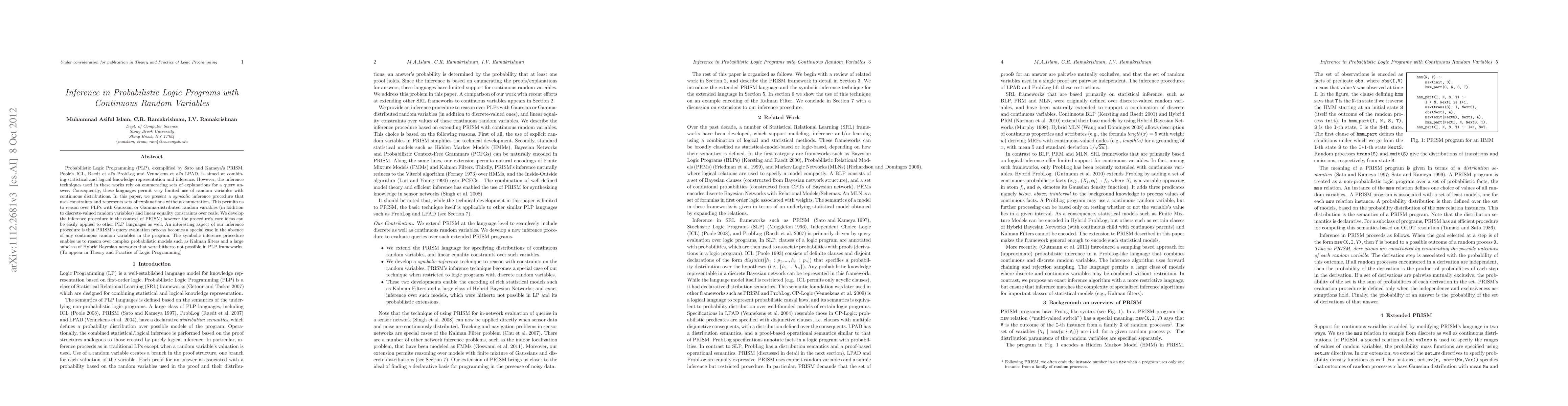 This paper introduces a symbolic inference procedure for Probabilistic Logic Programs (PLP) that allows reasoning with continuous random variables like Gaussian or Gamma distributions alongside discrete ones. This method uses constraints rather than enumeration, enabling the inference over complex models like Kalman filters and a subclass of Hybrid Bayesian networks that were previously intractable in existing PLP frameworks.