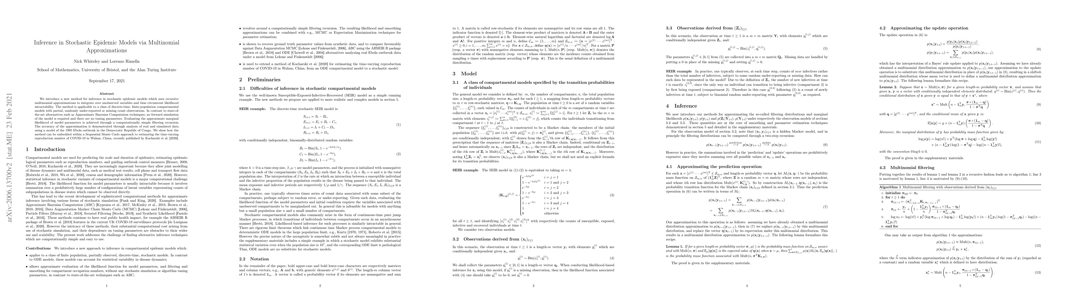 This paper proposes a new inference method for stochastic epidemic models using recursive multinomial approximations to handle unobserved variables without requiring forward simulation or tuning parameters. The method is demonstrated on the 1995 Ebola outbreak and applied within a Sequential Monte Carlo approach for estimating COVID-19's reproduction number in Wuhan.