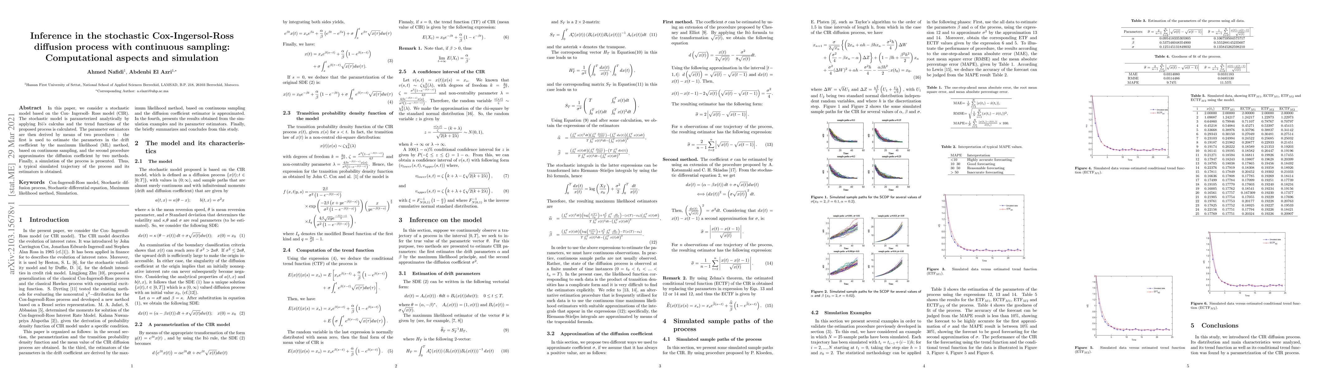In this paper, we consider a stochastic model based on the Cox- Ingersoll- Ross model (CIR). The stochastic model is parameterized analytically by applying It\^o's calculus and the trend functions of the proposed process is calculated. The parameter estimators are then derived by means of two procedures: the first is used to estimate the parameters in the drift coefficient by the maximum likelihood (ML) method, based on continuous sampling, and the second procedure approximates the diffusion coefficient by two methods. Finally, a simulation of the process is presented. Thus, a typical simulated trajectory of the process and its estimators is obtained.
