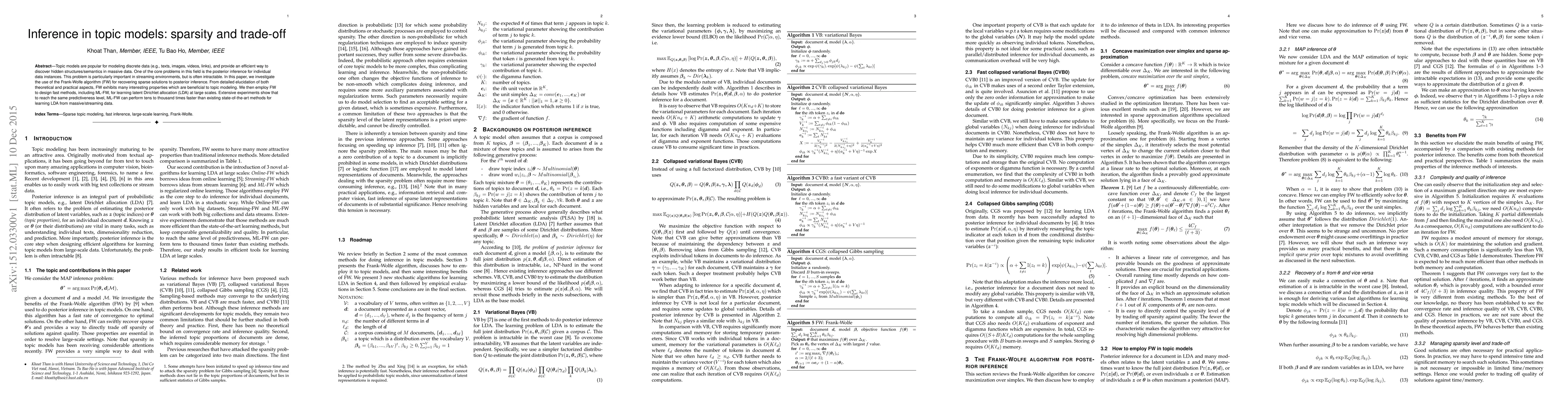 Topic models are popular for modeling discrete data (e.g., texts, images, videos, links), and provide an efficient way to discover hidden structures/semantics in massive data. One of the core problems in this field is the posterior inference for individual data instances. This problem is particularly important in streaming environments, but is often intractable. In this paper, we investigate the use of the Frank-Wolfe algorithm (FW) for recovering sparse solutions to posterior inference. From detailed elucidation of both theoretical and practical aspects, FW exhibits many interesting properties which are beneficial to topic modeling. We then employ FW to design fast methods, including ML-FW, for learning latent Dirichlet allocation (LDA) at large scales. Extensive experiments show that to reach the same predictiveness level, ML-FW can perform tens to thousand times faster than existing state-of-the-art methods for learning LDA from massive/streaming data.