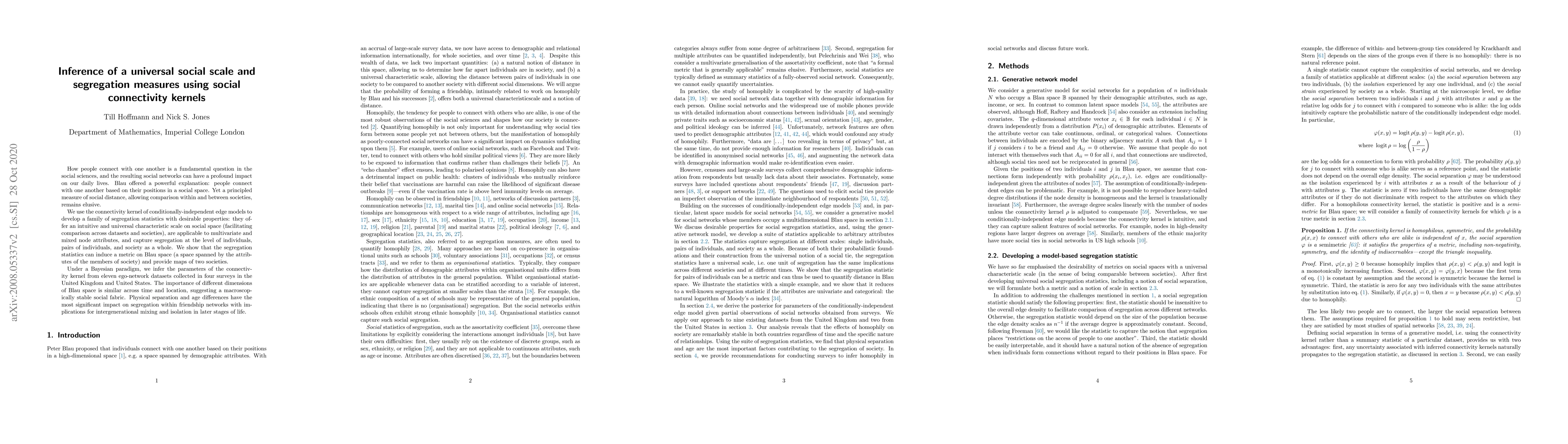 How people connect with one another is a fundamental question in the social sciences, and the resulting social networks can have a profound impact on our daily lives. Blau offered a powerful explanation: people connect with one another based on their positions in a social space. Yet a principled measure of social distance, allowing comparison within and between societies, remains elusive. We use the connectivity kernel of conditionally-independent edge models to develop a family of segregation statistics with desirable properties: they offer an intuitive and universal characteristic scale on social space (facilitating comparison across datasets and societies), are applicable to multivariate and mixed node attributes, and capture segregation at the level of individuals, pairs of individuals, and society as a whole. We show that the segregation statistics can induce a metric on Blau space (a space spanned by the attributes of the members of society) and provide maps of two societies. Under a Bayesian paradigm, we infer the parameters of the connectivity kernel from eleven ego-network datasets collected in four surveys in the United Kingdom and United States. The importance of different dimensions of Blau space is similar across time and location, suggesting a macroscopically stable social fabric. Physical separation and age differences have the most significant impact on segregation within friendship networks with implications for intergenerational mixing and isolation in later stages of life.