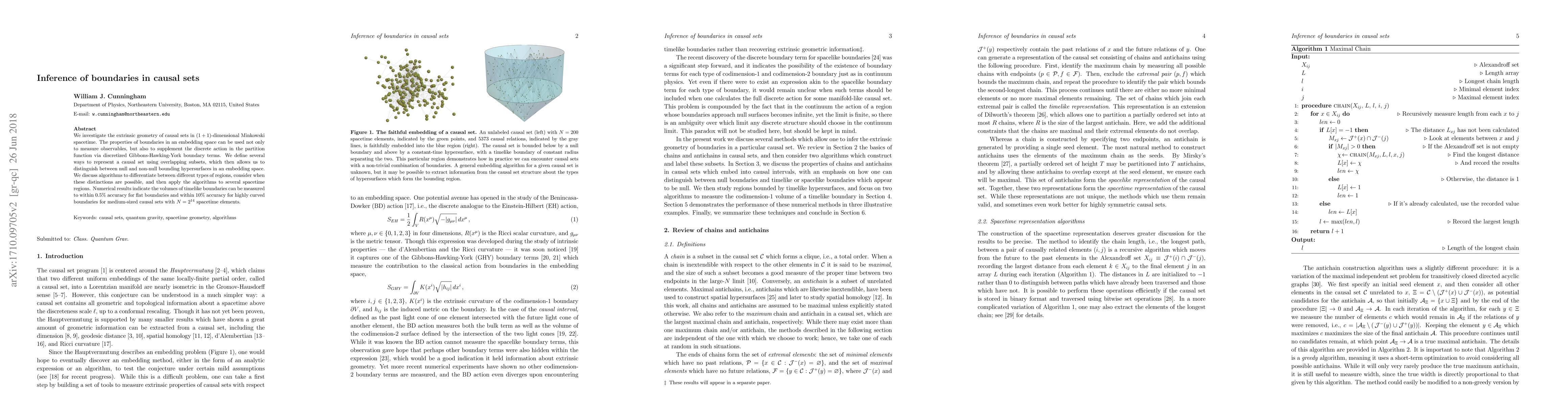 This paper explores the extrinsic geometry of causal sets in $(1+1)$-dimensional Minkowski spacetime, focusing on the use of boundary terms to supplement the discrete action. It defines methods to distinguish between null and non-null bounding hypersurfaces and presents algorithms to differentiate between various spacetime regions, achieving measurement accuracies of $0.5\%$ for flat and $10\%$ for curved boundaries.