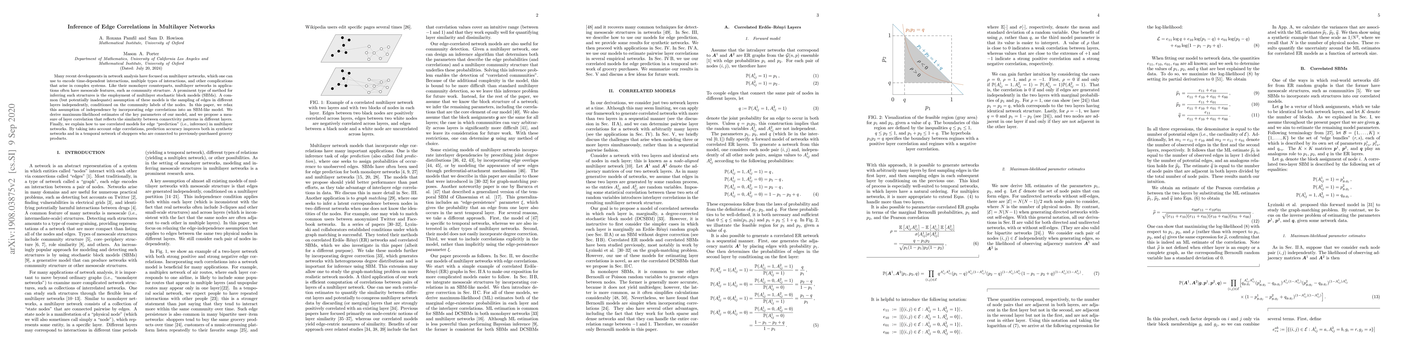 Many recent developments in network analysis have focused on multilayer networks, which one can use to encode time-dependent interactions, multiple types of interactions, and other complications that arise in complex systems. Like their monolayer counterparts, multilayer networks in applications often have mesoscale features, such as community structure. A prominent type of method for inferring such structures is the employment of multilayer stochastic block models (SBMs). A common (but {potentially} inadequate) assumption of these models is the sampling of edges in different layers independently, conditioned on the community labels of the nodes. In this paper, we relax this assumption of independence by incorporating edge correlations into an SBM-like model. We derive maximum-likelihood estimates of the key parameters of our model, and we propose a measure of layer correlation that reflects the similarity between connectivity patterns in different layers. Finally, we explain how to use correlated models for edge "prediction" (i.e., inference) in multilayer networks. By taking into account edge correlations, prediction accuracy improves both in synthetic networks and in a temporal network of shoppers who are connected to previously-purchased grocery products.