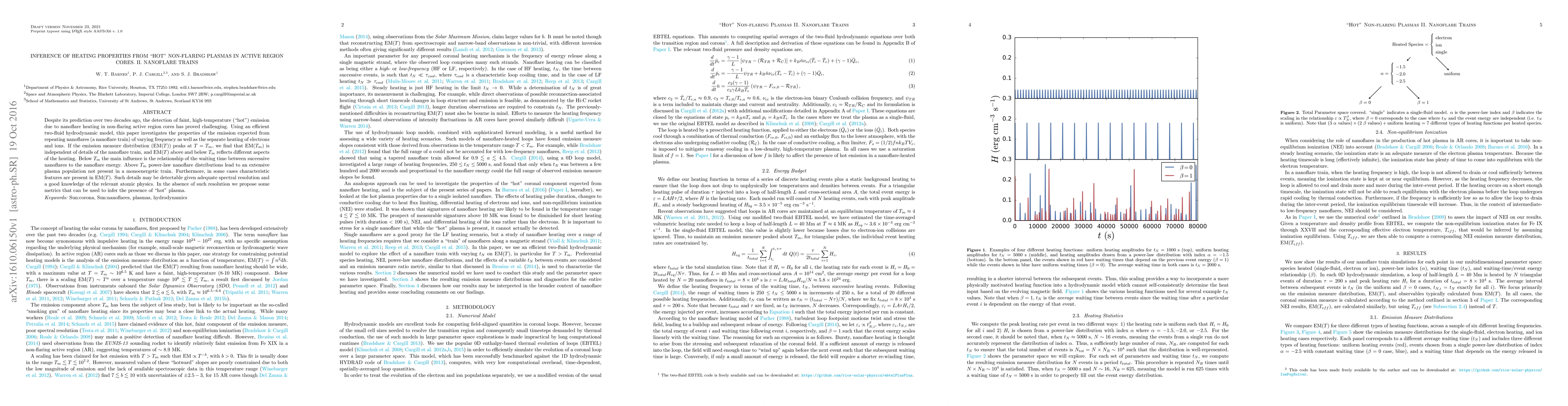 Despite its prediction over two decades ago, the detection of faint, high-temperature ("hot") emission due to nanoflare heating in non-flaring active region cores has proved challenging. Using an efficient two-fluid hydrodynamic model, this paper investigates the properties of the emission expected from repeating nanoflares (a nanoflare train) of varying frequency as well as the separate heating of electrons and ions. If the emission measure distribution ($\mathrm{EM}(T)$) peaks at $T = T_m$, we find that $\mathrm{EM}(T_m)$ is independent of details of the nanoflare train, and $\mathrm{EM}(T)$ above and below $T_m$ reflects different aspects of the heating. Below $T_m$ the main influence is the relationship of the waiting time between successive nanoflares to the nanoflare energy. Above $T_m$ power-law nanoflare distributions lead to an extensive plasma population not present in a monoenergetic train. Furthermore, in some cases characteristic features are present in $\mathrm{EM}(T)$. Such details may be detectable given adequate spectral resolution and a good knowledge of the relevant atomic physics. In the absence of such resolution we propose some metrics that can be used to infer the presence of "hot" plasma.