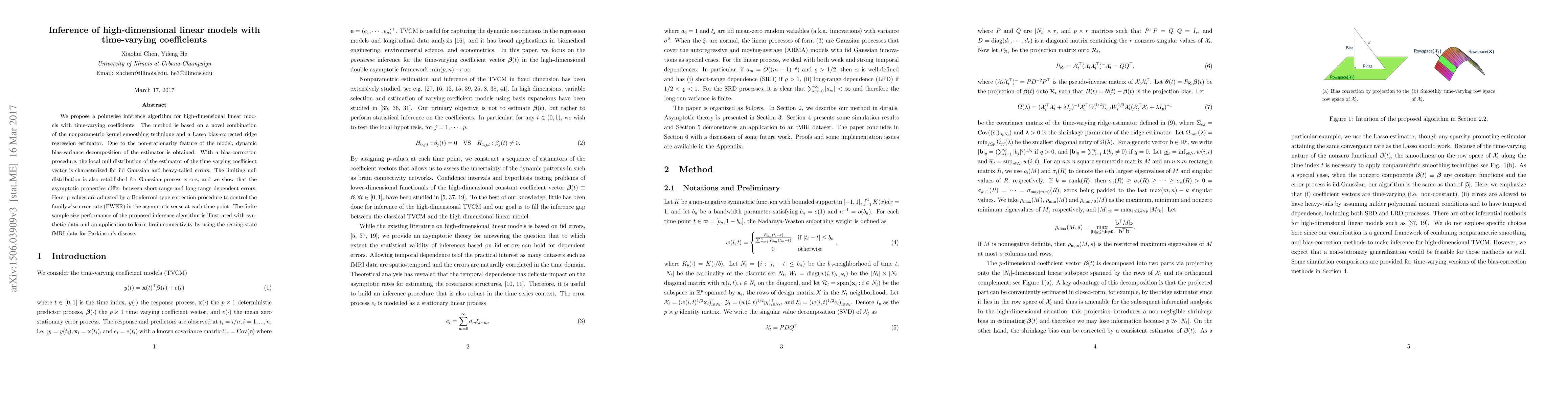 This paper proposes a novel inference algorithm for high-dimensional linear models with time-varying coefficients, combining kernel smoothing and Lasso bias-corrected ridge regression. The method addresses dynamic bias-variance trade-offs and establishes limiting null distributions for different error types, with p-values adjusted to control the familywise error rate.