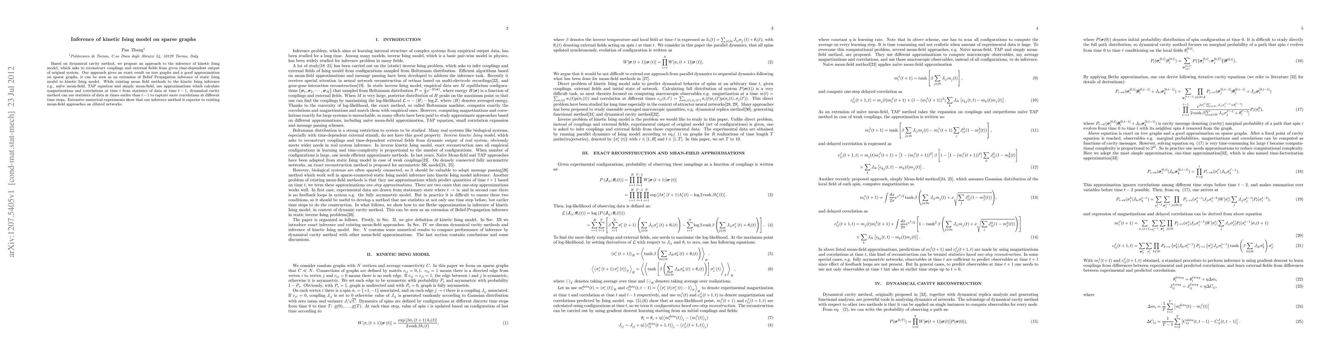 This paper proposes an inference method for kinetic Ising models on sparse graphs using the dynamical cavity method, achieving exact results on tree graphs and good approximations on sparse graphs. It outperforms existing mean-field methods by utilizing statistics from multiple time steps to capture correlations better.