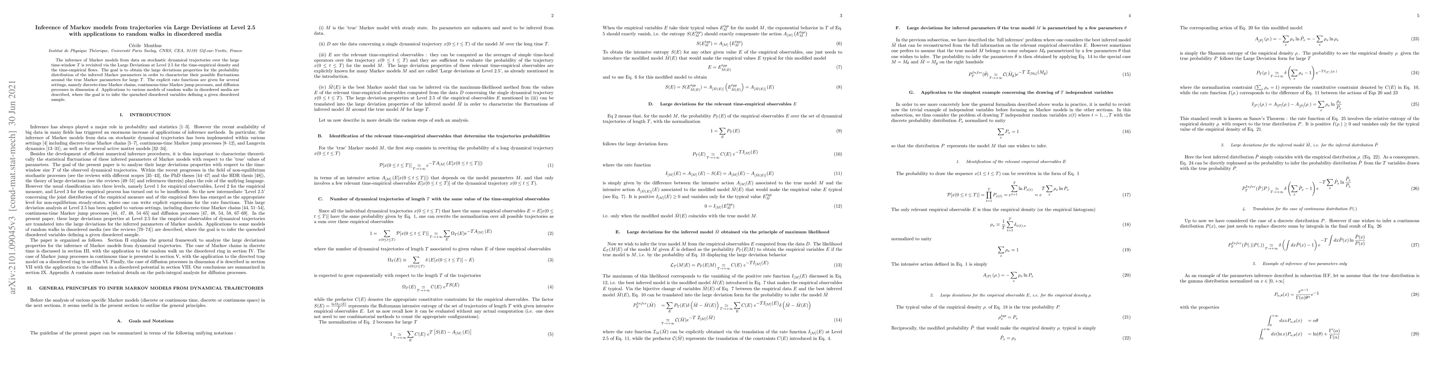 This paper develops a method for inferring Markov models from stochastic dynamical trajectories using Large Deviations at Level 2.5, providing explicit rate functions for Markov chains, Markov jump processes, and diffusion processes. Applications focus on random walks in disordered media to infer quenched disordered variables.
