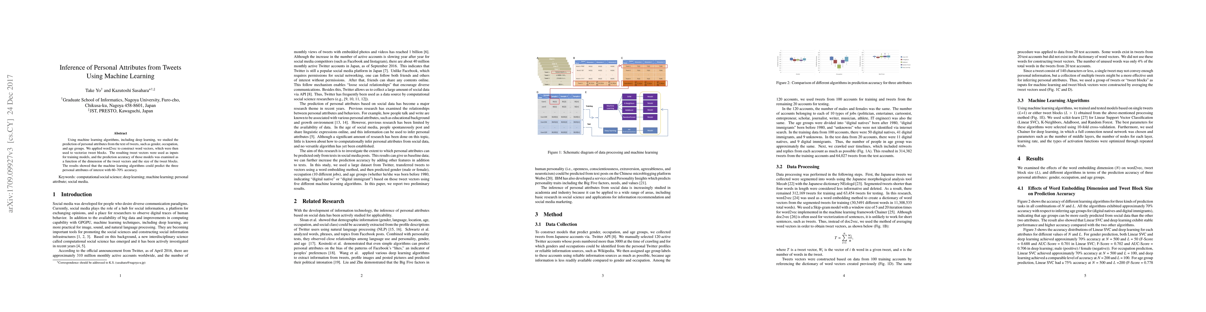 Using machine learning algorithms, including deep learning, we studied the prediction of personal attributes from the text of tweets, such as gender, occupation, and age groups. We applied word2vec to construct word vectors, which were then used to vectorize tweet blocks. The resulting tweet vectors were used as inputs for training models, and the prediction accuracy of those models was examined as a function of the dimension of the tweet vectors and the size of the tweet blacks. The results showed that the machine learning algorithms could predict the three personal attributes of interest with 60-70% accuracy.