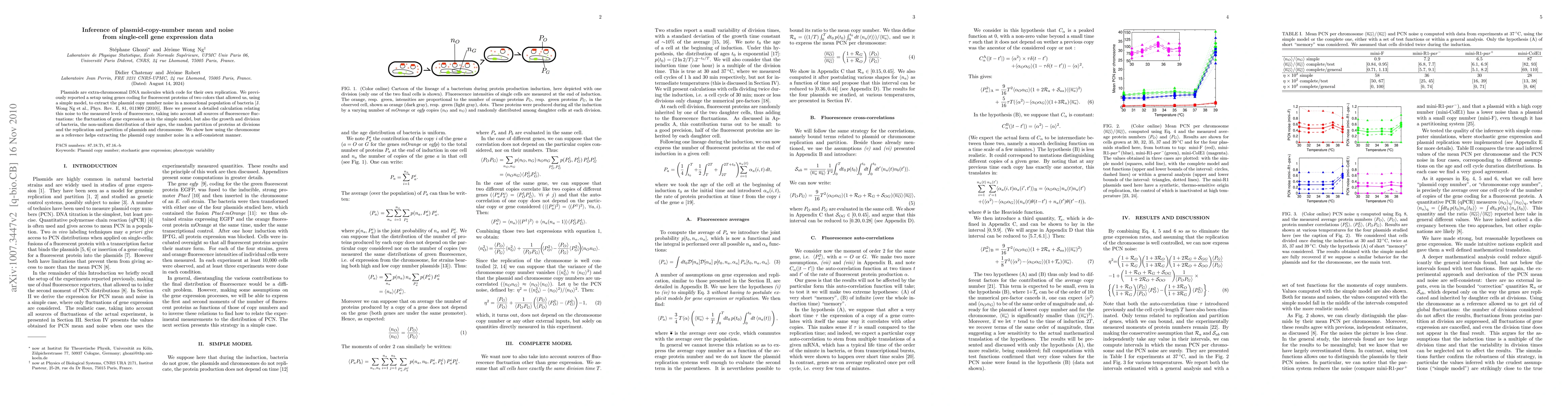 Plasmids are extra-chromosomal DNA molecules which code for their own replication. We previously reported a setup using genes coding for fluorescent proteins of two colors that allowed us, using a simple model, to extract the plasmid copy number noise in a monoclonal population of bacteria [J. Wong Ng et al., Phys. Rev. E, 81, 011909 (2010)]. Here we present a detailed calculation relating this noise to the measured levels of fluorescence, taking into account all sources of fluorescence fluctuations: the fluctuation of gene expression as in the simple model, but also the growth and division of bacteria, the non-uniform distribution of their ages, the random partition of proteins at divisions and the replication and partition of plasmids and chromosome. We show how using the chromosome as a reference helps extracting the plasmid copy number noise in a self-consistent manner.