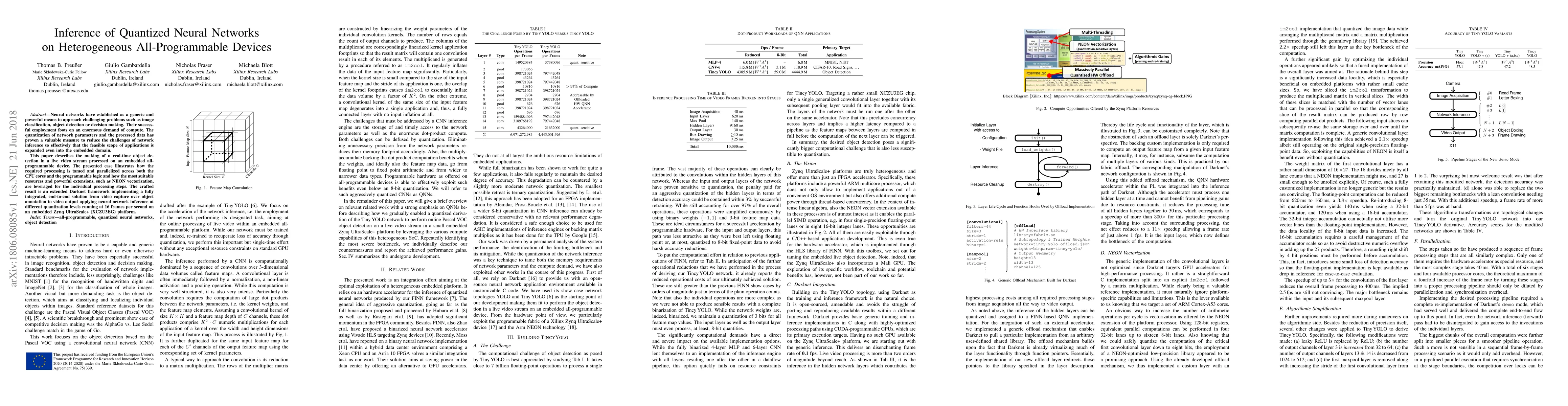 This paper explores the inference of quantized neural networks on heterogeneous all-programmable devices, demonstrating real-time object detection in live video streams on an embedded Zynq UltraScale+ platform. It details the optimization and parallelization of processing across CPU cores and programmable logic, utilizing NEON vectorization for enhanced performance.