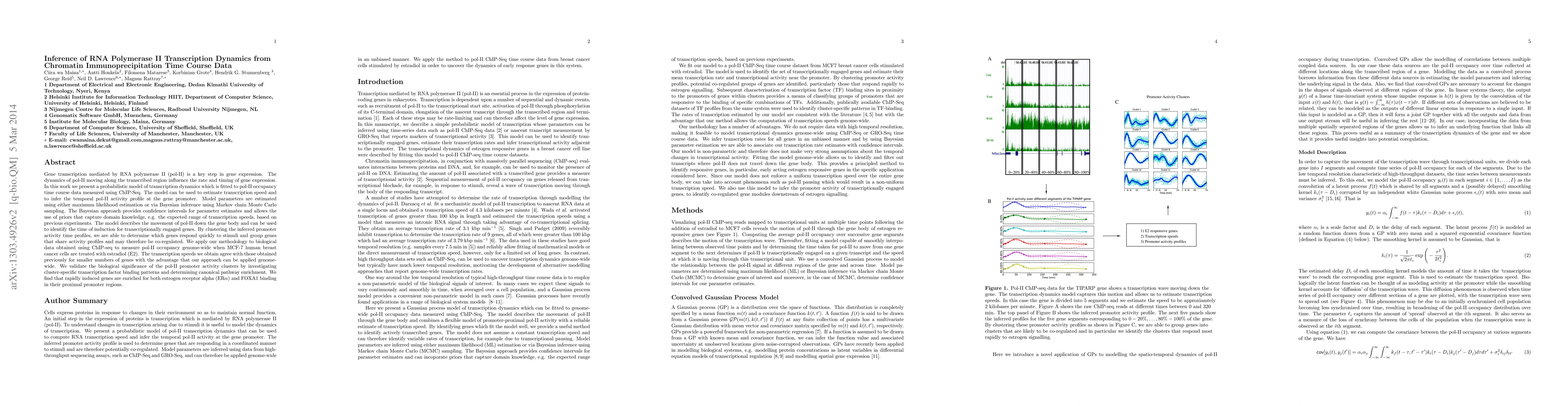 This paper presents a probabilistic model to infer RNA polymerase II (pol-II) transcription dynamics from ChIP-Seq data, estimating transcription speed and promoter activity profiles. The Bayesian approach provides confidence intervals and allows for domain knowledge integration, enabling genome-wide application and identification of co-regulated gene clusters.