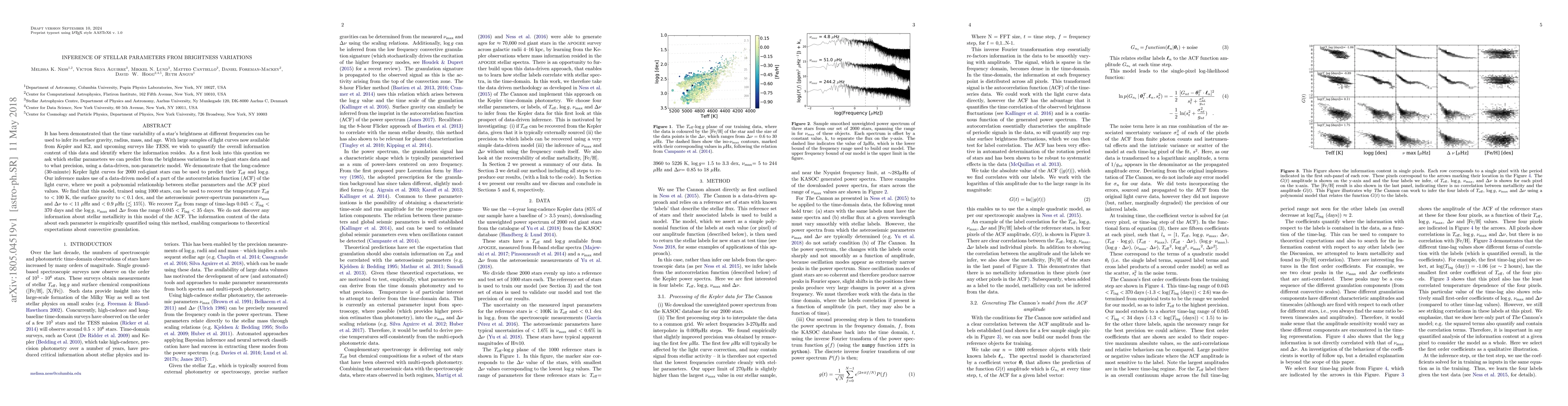 It has been demonstrated that the time variability of a star's brightness at different frequencies can be used to infer its surface gravity, radius, mass, and age. With large samples of light curves now available from Kepler and K2, and upcoming surveys like TESS, we wish to quantify the overall information content of this data and identify where the information resides. As a first look into this question we ask which stellar parameters we can predict from the brightness variations in red-giant stars data and to what precision, using a data-driven model. We demonstrate that the long-cadence (30-minute) Kepler light curves for 2000 red-giant stars can be used to predict their $T_{\rm eff}$ and $\log g$. Our inference makes use of a data-driven model of a part of the autocorrelation function (ACF) of the light curve, where we posit a polynomial relationship between stellar parameters and the ACF pixel values. We find that this model, trained using 1000 stars, can be used to recover the temperature $T_{\rm eff}$ to $<$100 K, the surface gravity to $<$ 0.1 dex, and the asteroseismic power-spectrum parameters $\rm \nu_{max}$ and $\rm \Delta{\nu}$ to $<11$ $\mu$Hz and $<0.9$ $\mu$Hz ($\lesssim$ 15\%). We recover $T_{\rm eff}$ from range of time-lags 0.045 $<$ $T_{\rm lag}$ $<$ 370 days and the $\log g$, $\rm \nu_{max}$ and $\rm \Delta{\nu}$ from the range 0.045 $<$ $T_{\rm lag}$ $<$ 35 days. We do not discover any information about stellar metallicity. The information content of the data about each parameter is empirically quantified using this method, enabling comparisons to theoretical expectations about convective granulation.