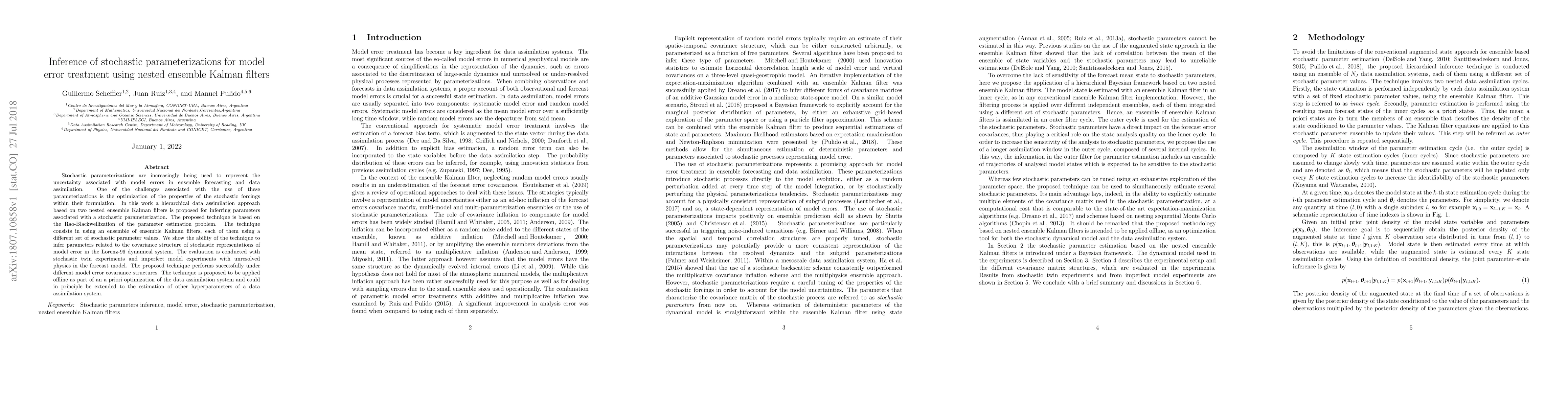 This paper proposes a nested ensemble Kalman filter approach to infer stochastic parameterizations for model error treatment, optimizing the properties of stochastic forcings. The method successfully estimates parameters in the Lorenz-96 system and shows potential for broader application in data assimilation systems.