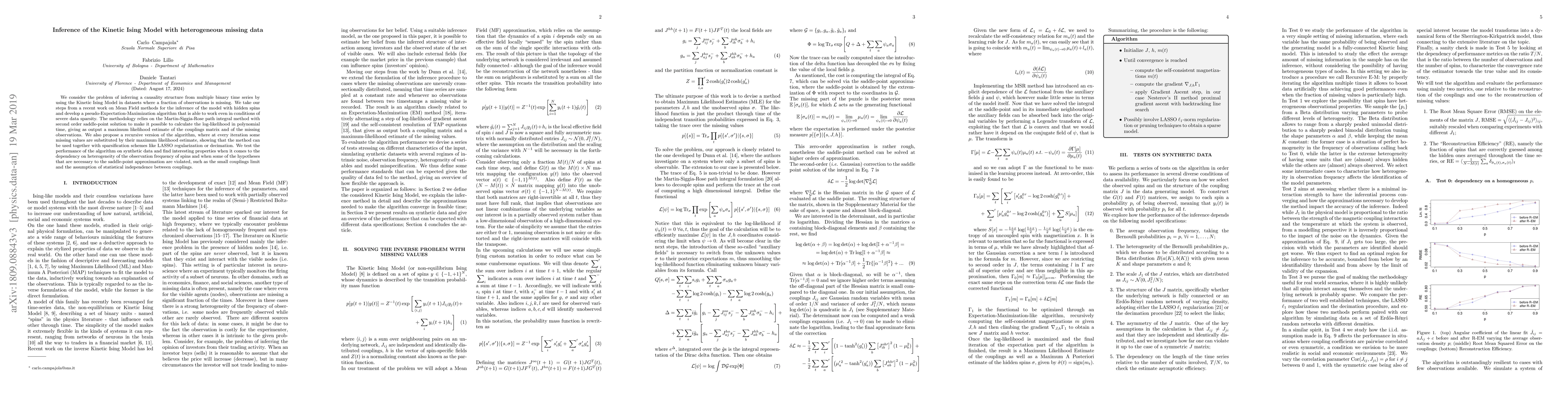 This paper develops a pseudo-Expectation-Maximization algorithm to infer the causality structure from binary time series using the Kinetic Ising Model, even with severe missing data. It employs the Martin-Siggia-Rose path integral method to calculate the log-likelihood efficiently, and tests its performance on synthetic data, showing robustness under data sparsity and heterogeneity.