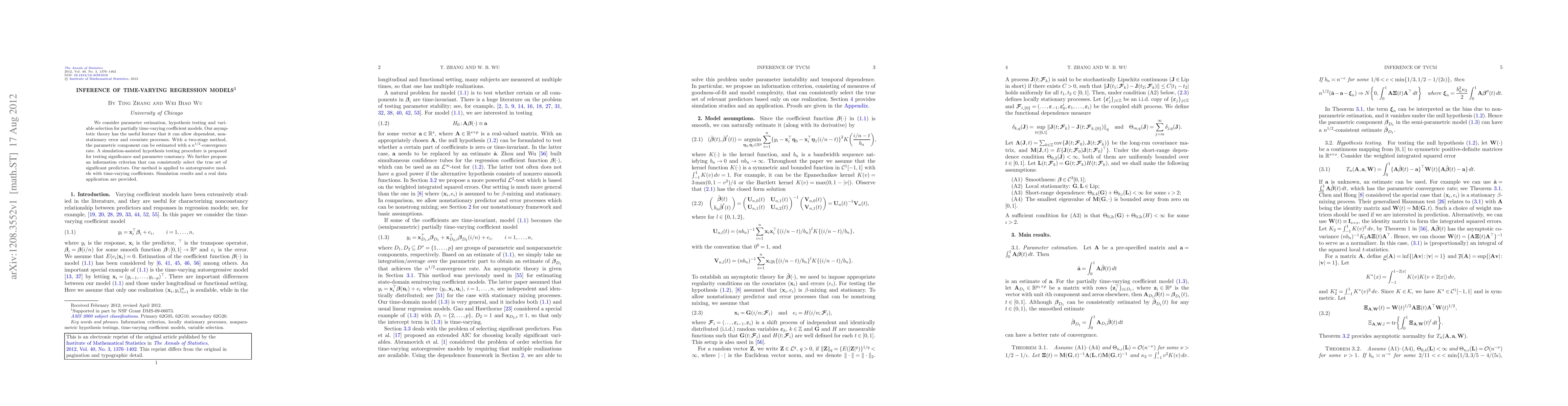 We consider parameter estimation, hypothesis testing and variable selection for partially time-varying coefficient models. Our asymptotic theory has the useful feature that it can allow dependent, nonstationary error and covariate processes. With a two-stage method, the parametric component can be estimated with a $n^{1/2}$-convergence rate. A simulation-assisted hypothesis testing procedure is proposed for testing significance and parameter constancy. We further propose an information criterion that can consistently select the true set of significant predictors. Our method is applied to autoregressive models with time-varying coefficients. Simulation results and a real data application are provided.