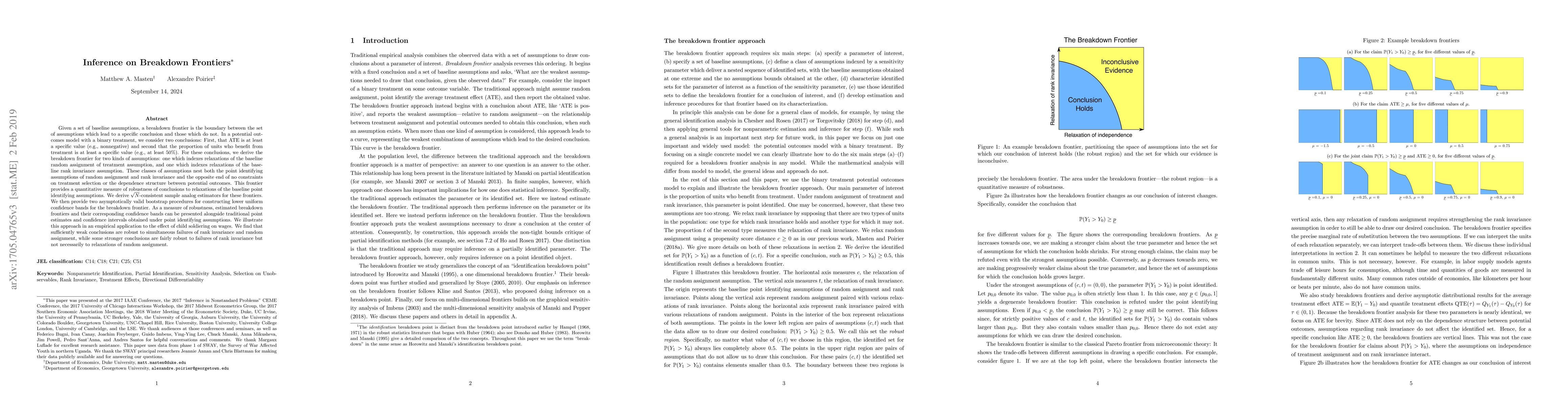 Given a set of baseline assumptions, a breakdown frontier is the boundary between the set of assumptions which lead to a specific conclusion and those which do not. In a potential outcomes model with a binary treatment, we consider two conclusions: First, that ATE is at least a specific value (e.g., nonnegative) and second that the proportion of units who benefit from treatment is at least a specific value (e.g., at least 50\%). For these conclusions, we derive the breakdown frontier for two kinds of assumptions: one which indexes relaxations of the baseline random assignment of treatment assumption, and one which indexes relaxations of the baseline rank invariance assumption. These classes of assumptions nest both the point identifying assumptions of random assignment and rank invariance and the opposite end of no constraints on treatment selection or the dependence structure between potential outcomes. This frontier provides a quantitative measure of robustness of conclusions to relaxations of the baseline point identifying assumptions. We derive $\sqrt{N}$-consistent sample analog estimators for these frontiers. We then provide two asymptotically valid bootstrap procedures for constructing lower uniform confidence bands for the breakdown frontier. As a measure of robustness, estimated breakdown frontiers and their corresponding confidence bands can be presented alongside traditional point estimates and confidence intervals obtained under point identifying assumptions. We illustrate this approach in an empirical application to the effect of child soldiering on wages. We find that sufficiently weak conclusions are robust to simultaneous failures of rank invariance and random assignment, while some stronger conclusions are fairly robust to failures of rank invariance but not necessarily to relaxations of random assignment.