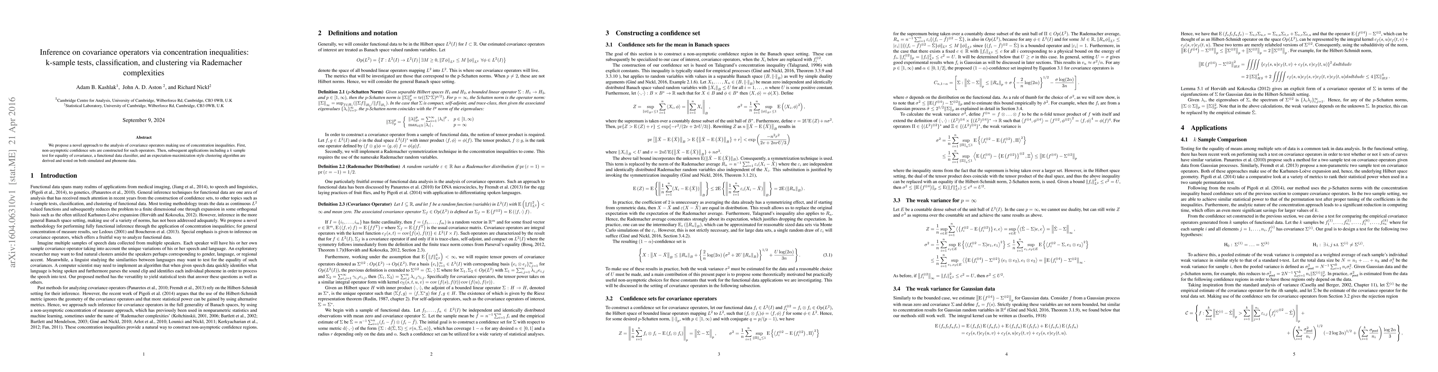 We propose a novel approach to the analysis of covariance operators making use of concentration inequalities. First, non-asymptotic confidence sets are constructed for such operators. Then, subsequent applications including a k sample test for equality of covariance, a functional data classifier, and an expectation-maximization style clustering algorithm are derived and tested on both simulated and phoneme data.
