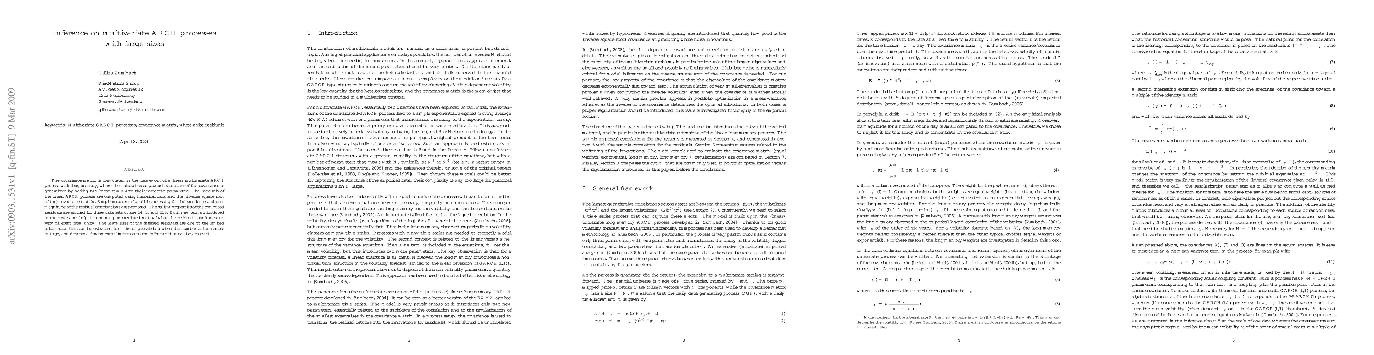 This paper explores the inference on multivariate ARCH processes with large sizes, introducing new terms to generalize the covariance matrix. It finds that while the residuals are uncorrelated, their magnitudes deviate from unity due to the inherent limitations of extracting information from large datasets.