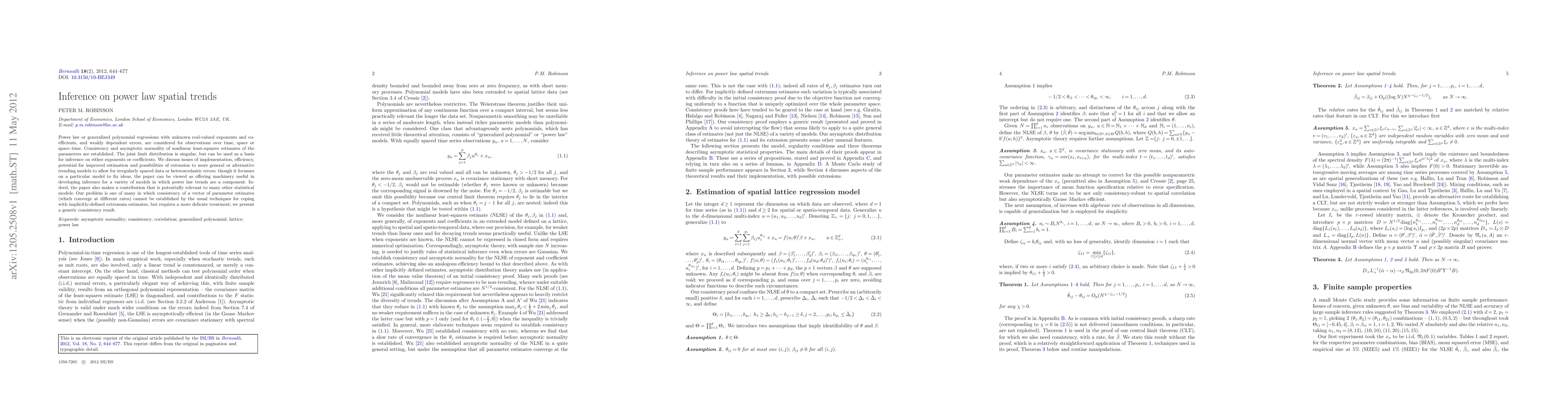 This research paper investigates power law spatial trends in observations over time, space, or space--time, establishing consistency and asymptotic normality of nonlinear least-squares estimates. It also presents a generic consistency result for vector parameter estimates that converge at different rates.