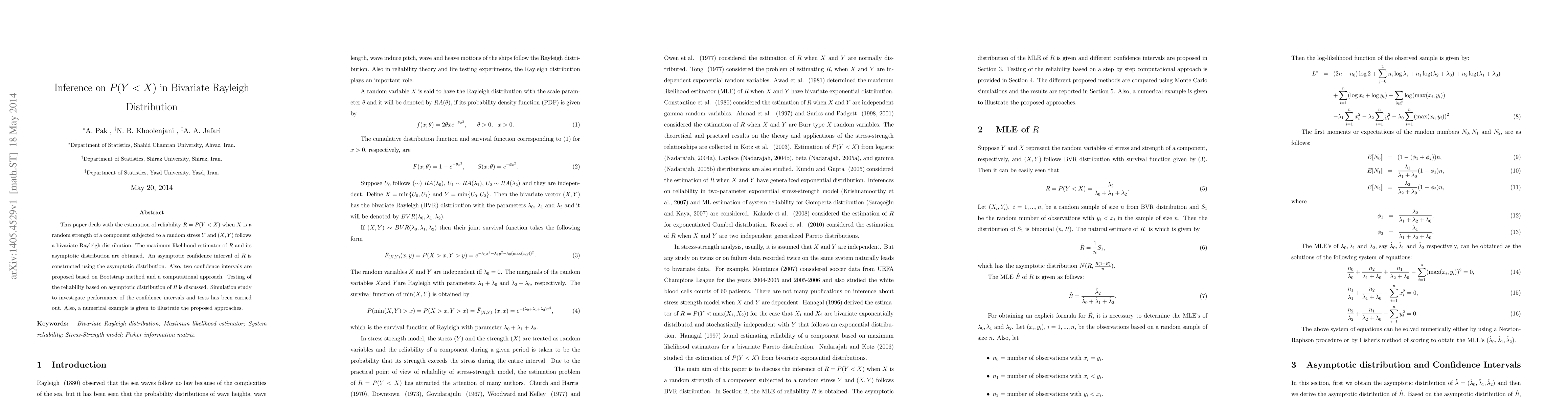 This paper estimates the reliability $R=P(Y<X)$ in a bivariate Rayleigh distribution, deriving the maximum likelihood estimator and its asymptotic distribution. It proposes confidence intervals and tests for reliability, evaluates their performance via simulation, and provides a numerical example.