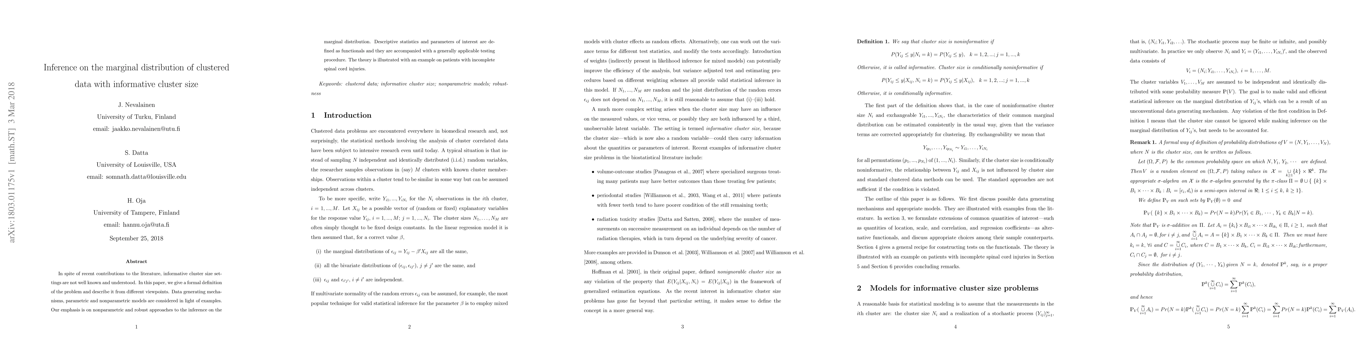 This paper defines and explores the inference on the marginal distribution of clustered data where cluster size is informative. It focuses on nonparametric and robust methods, providing a generally applicable testing procedure and illustrating the theory with an example involving patients with incomplete spinal cord injuries.