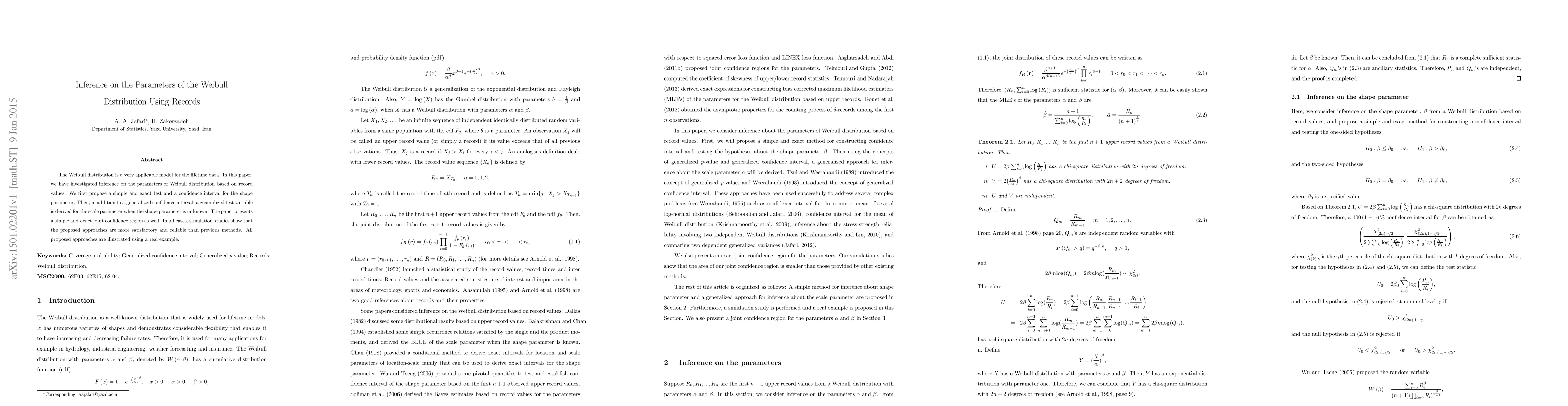 The Weibull distribution is a very applicable model for the lifetime data. In this paper, we have investigated inference on the parameters of Weibull distribution based on record values. We first propose a simple and exact test and a confidence interval for the shape parameter. Then, in addition to a generalized confidence interval, a generalized test variable is derived for the scale parameter when the shape parameter is unknown. The paper presents a simple and exact joint confidence region as well. %for the scale and shape parameters. In all cases, simulation studies show that the proposed approaches are more satisfactory and reliable than previous methods. All proposed approaches are illustrated using a real example.