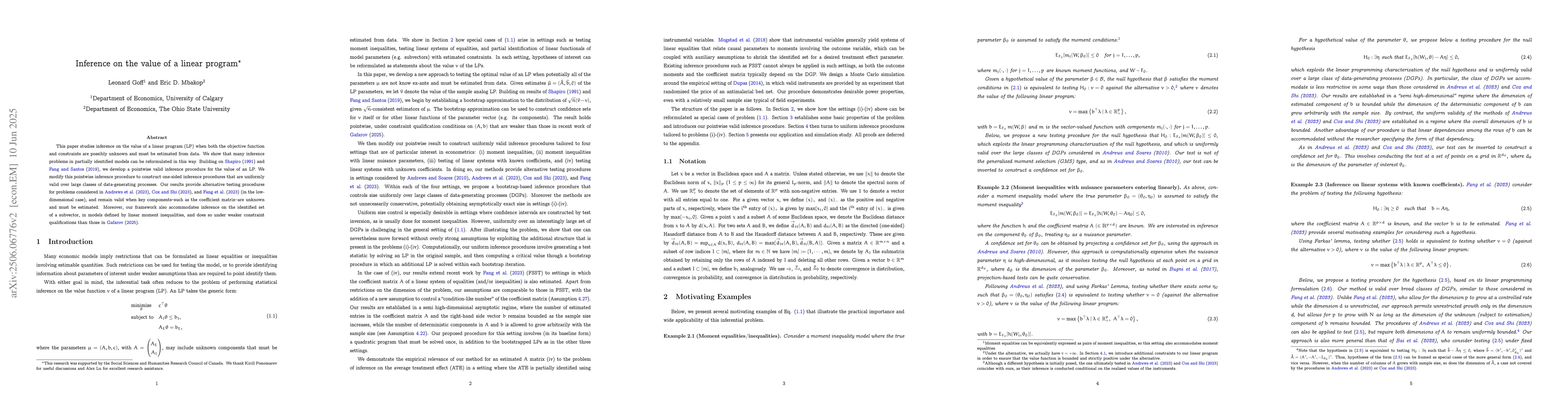 This paper studies inference on the value of a linear program (LP) when both the objective function and constraints are possibly unknown and must be estimated from data. We show that many inference problems in partially identified models can be reformulated in this way. Building on Shapiro (1991) and Fang and Santos (2019), we develop a pointwise valid inference procedure for the value of an LP. We modify this pointwise inference procedure to construct one-sided inference procedures that are uniformly valid over large classes of data-generating processes. Our results provide alternative testing procedures for problems considered in Andrews et al. (2023), Cox and Shi (2023), and Fang et al. (2023) (in the low-dimensional case), and remain valid when key components--such as the coefficient matrix--are unknown and must be estimated. Moreover, our framework also accommodates inference on the identified set of a subvector, in models defined by linear moment inequalities, and does so under weaker constraint qualifications than those in Gafarov (2025).