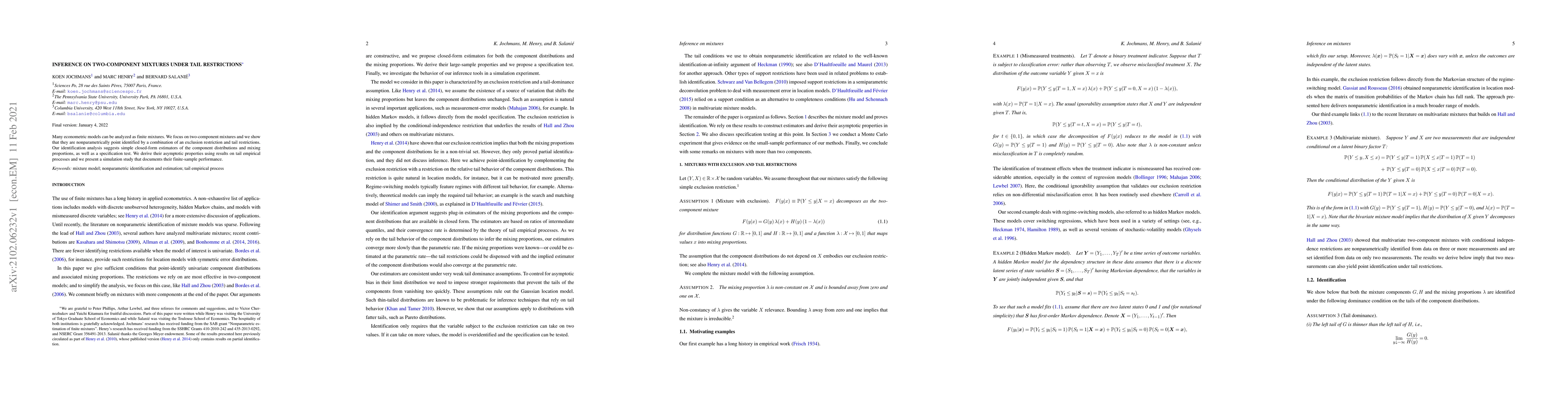 This research paper shows that two-component mixtures in econometrics can be identified without knowing the individual parameters using a combination of exclusion restrictions and tail restrictions. It also provides simple estimators and tests for these models.