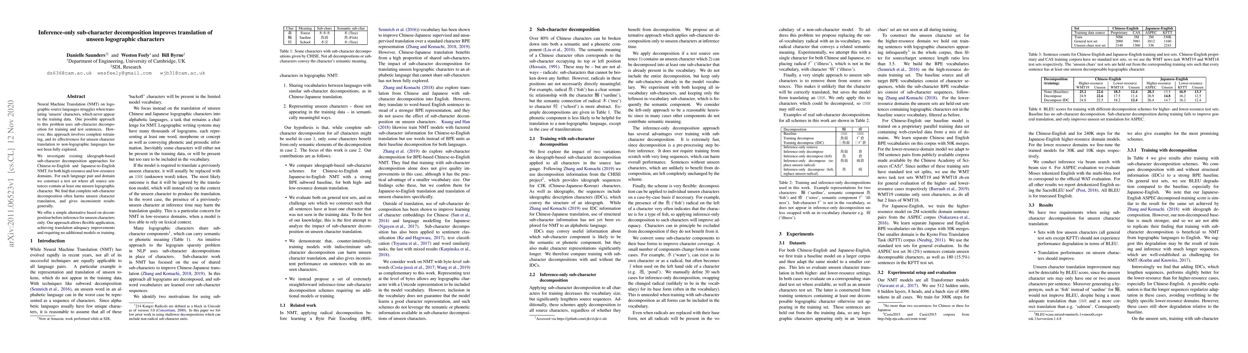 This paper explores sub-character decomposition for improving NMT translation of unseen logographic characters, finding that complete decomposition harms translation and inconsistently performs. It proposes an inference-only sub-character decomposition method that enhances translation adequacy without requiring additional training or models.