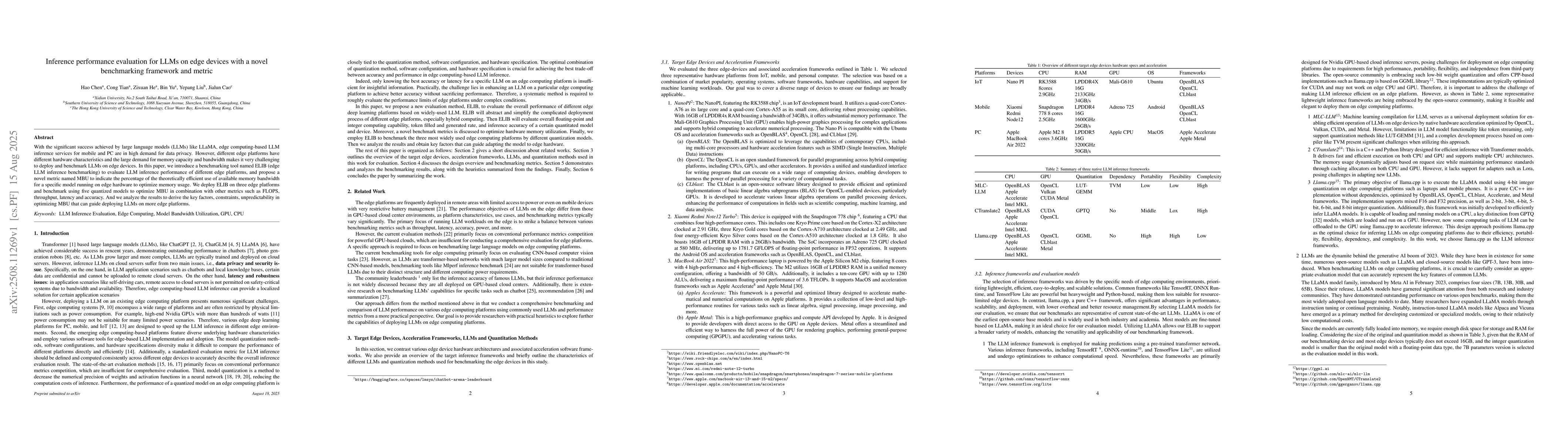 With the significant success achieved by large language models (LLMs) like LLaMA, edge computing-based LLM inference services for mobile and PC are in high demand for data privacy. However, different edge platforms have different hardware characteristics and the large demand for memory capacity and bandwidth makes it very challenging to deploy and benchmark LLMs on edge devices. In this paper, we introduce a benchmarking tool named ELIB (edge LLM inference benchmarking) to evaluate LLM inference performance of different edge platforms, and propose a novel metric named MBU to indicate the percentage of the theoretically efficient use of available memory bandwidth for a specific model running on edge hardware to optimize memory usage. We deploy ELIB on three edge platforms and benchmark using five quantized models to optimize MBU in combination with other metrics such as FLOPS, throughput, latency and accuracy. And we analyze the results to derive the key factors, constraints, unpredictability in optimizing MBU that can guide deploying LLMs on more edge platforms.