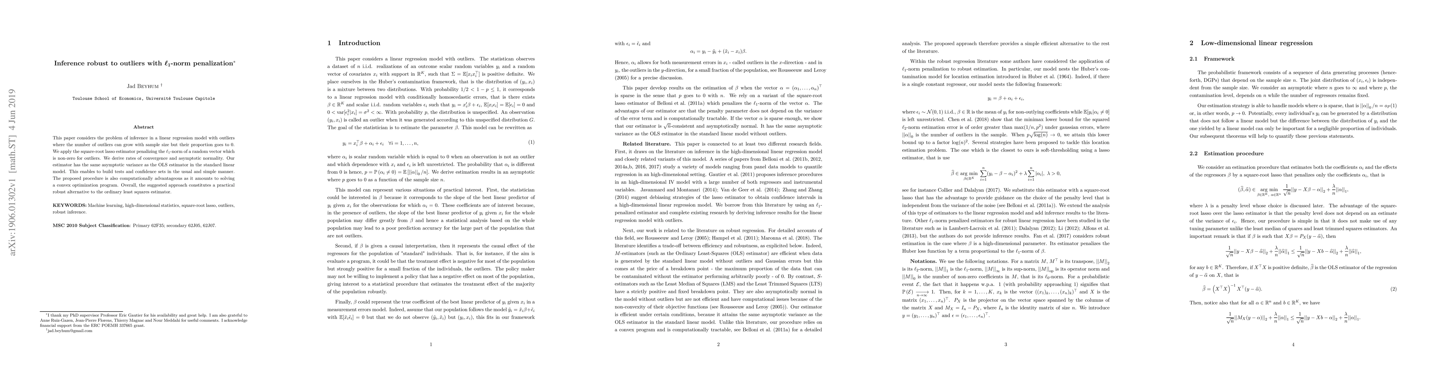 This paper proposes a square-root lasso estimator using l1-norm penalization to handle inference in linear regression models robust to outliers. The method achieves asymptotic normality and the same variance as OLS, allowing for straightforward test construction and confidence sets, while being computationally efficient.