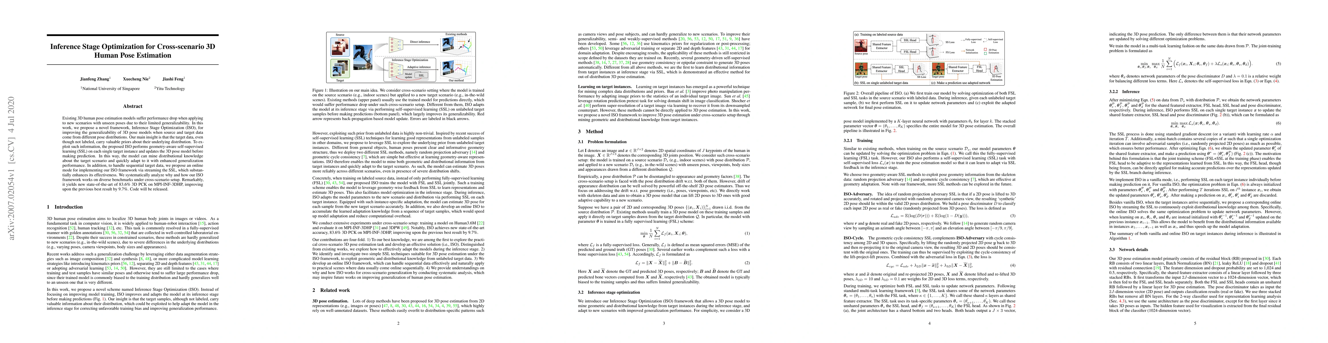 This paper proposes a novel Inference Stage Optimization (ISO) framework to enhance the generalizability of 3D human pose estimation models across different scenarios. The ISO framework leverages unlabeled target data for geometry-aware self-supervised learning to adapt the model dynamically, achieving state-of-the-art results with 83.6% 3D PCK on MPI-INF-3DHP.